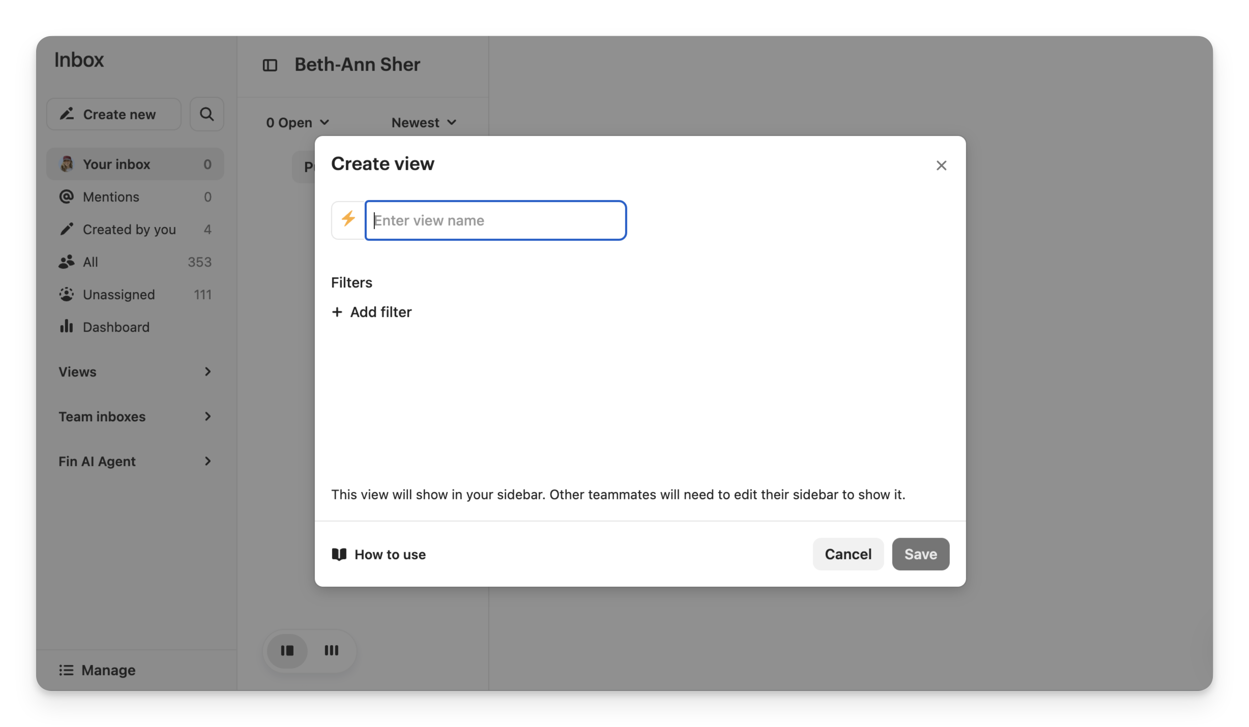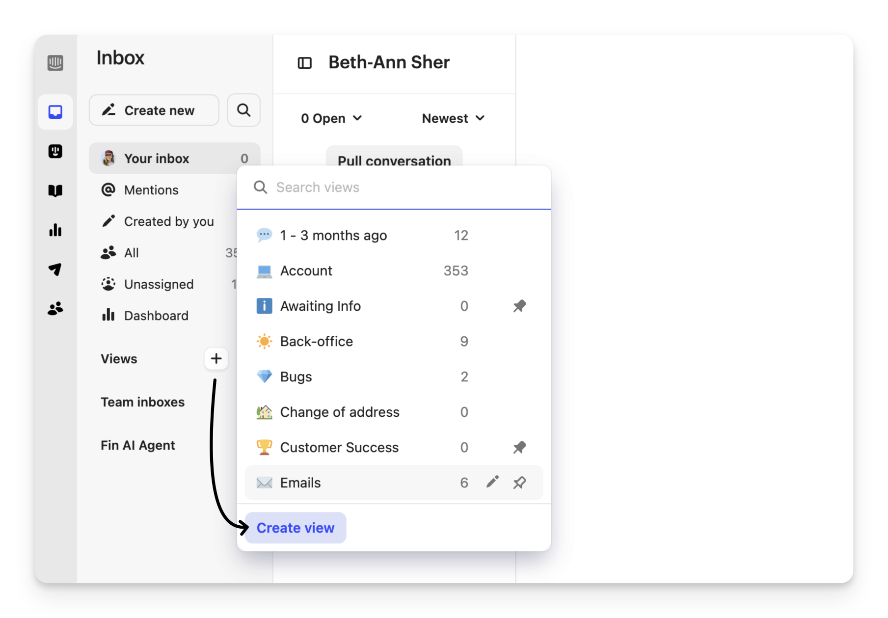 to make changes to a team view or inbox and save them.Add views or team inboxes — Click Create view to add a view or inbox to your list.