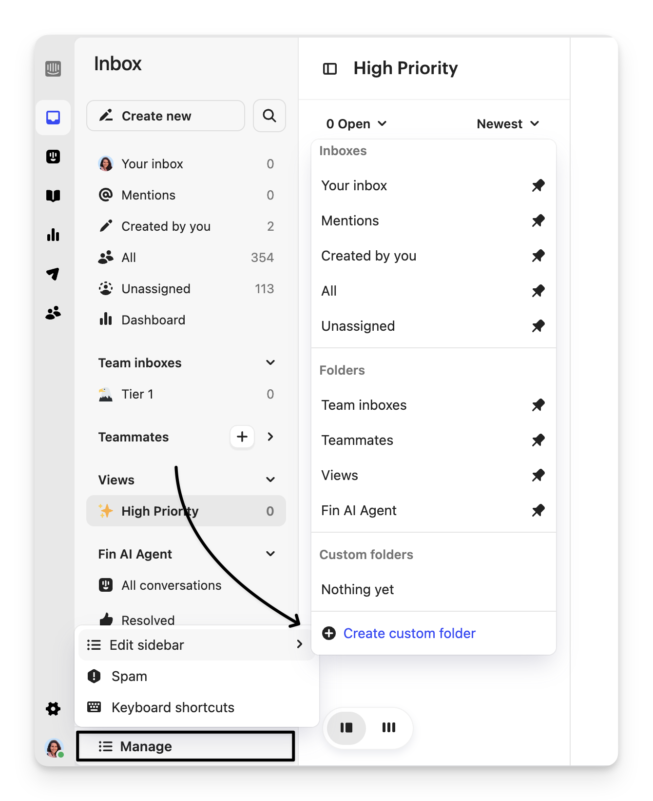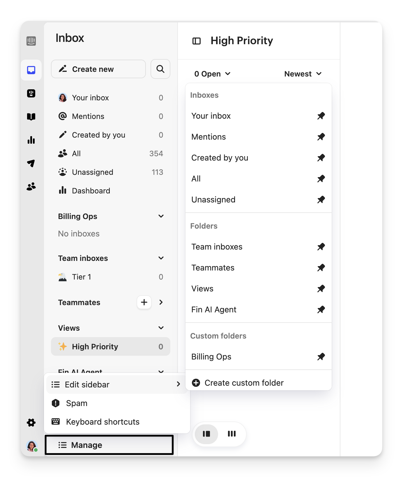 To reorder your views and team inboxes, simply drag and drop them into position on your sidebar with the handle icon.