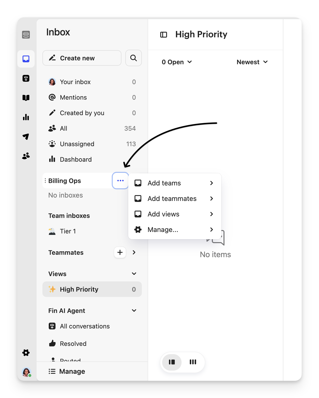 This will add the folder to your sidebar. Hover over the folder and click the 3 dots to start adding a mix of teams, teammates or views by pinning hem
