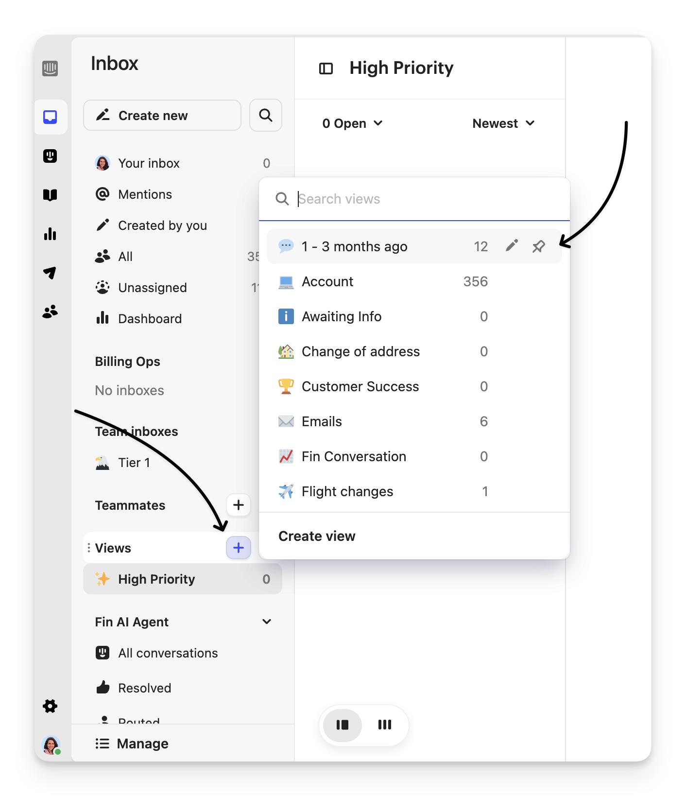 Inbox custom views allow you to define a set of filters, including conversation attributes, and then show all conversations that match those filters in real time. Quickly switch between views and keep an eye on urgent issues, your direct reports, or whichever conversations you consider most important.
