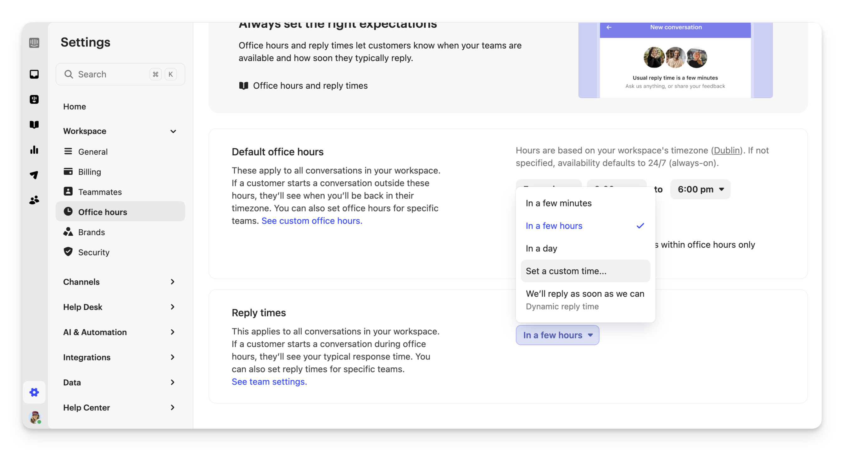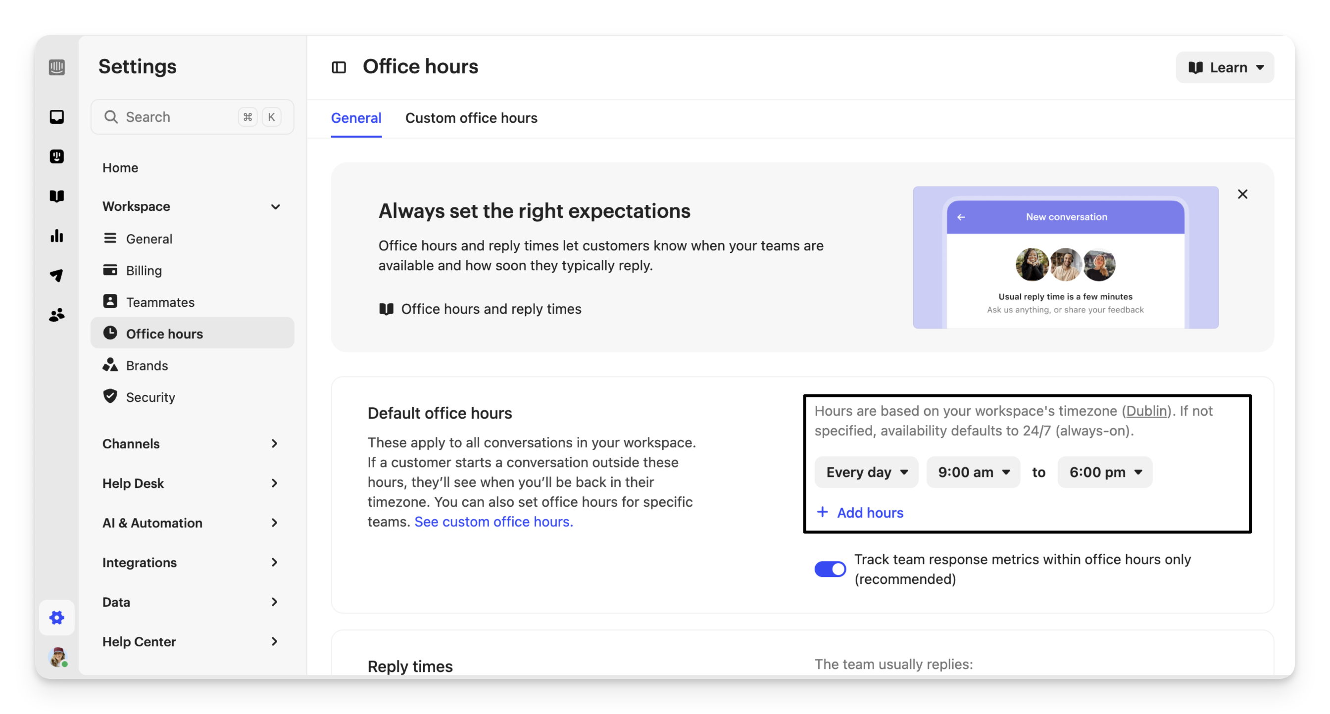 You can also set your reply times when editing your office hours in Settings > Workspace > Office Hours.