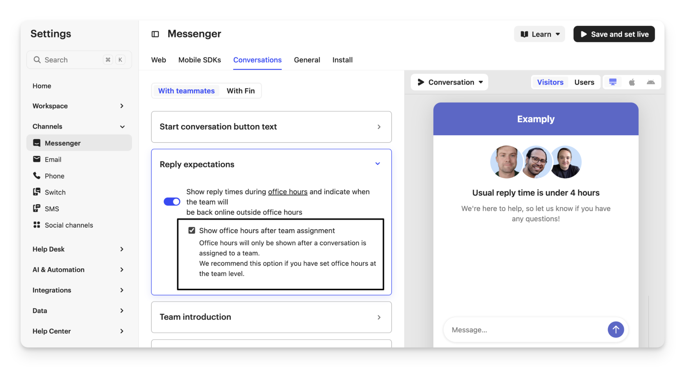To only show office hours and reply times after a conversation has been assigned to a team, go to Settings > Channels > Messenger > Conversations > Reply expectations and turn on the toggle, then select the checkbox "Show only once a conversation is assigned to a team".