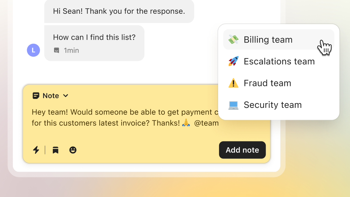Simply create teams using Team Inboxes here, then type “@” in a conversation note to search for and mention your team.