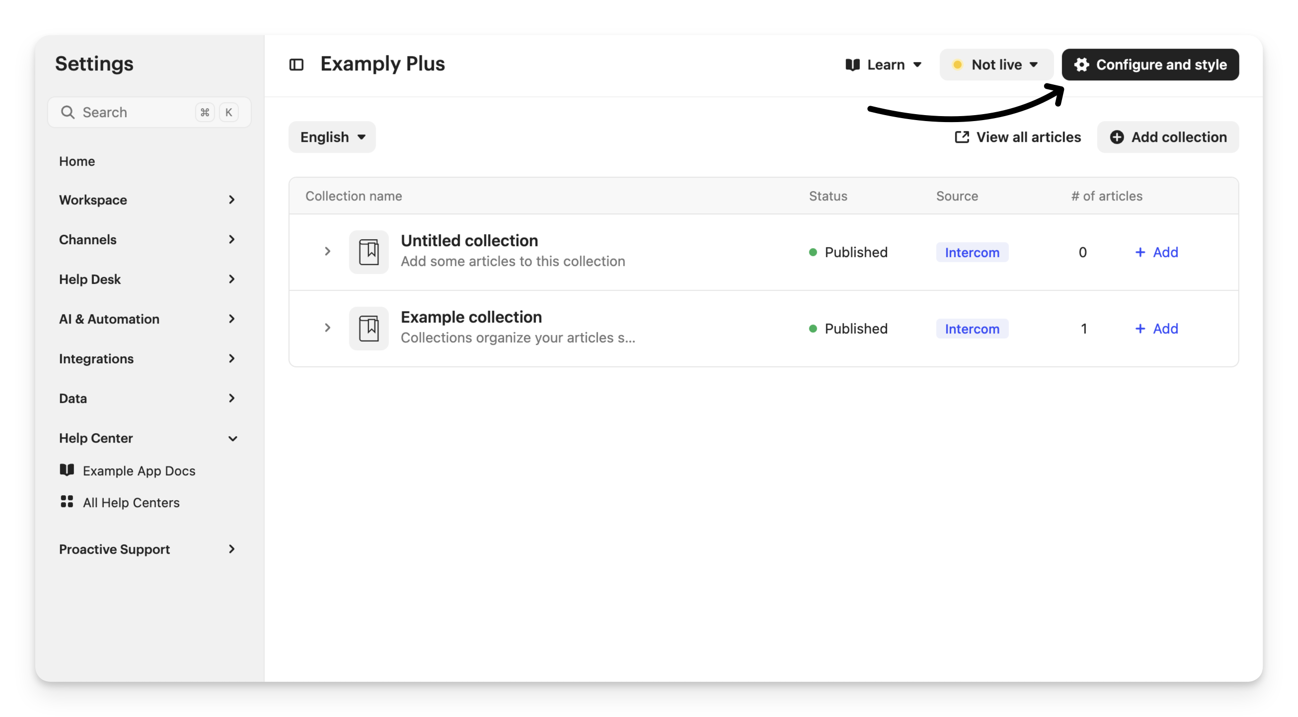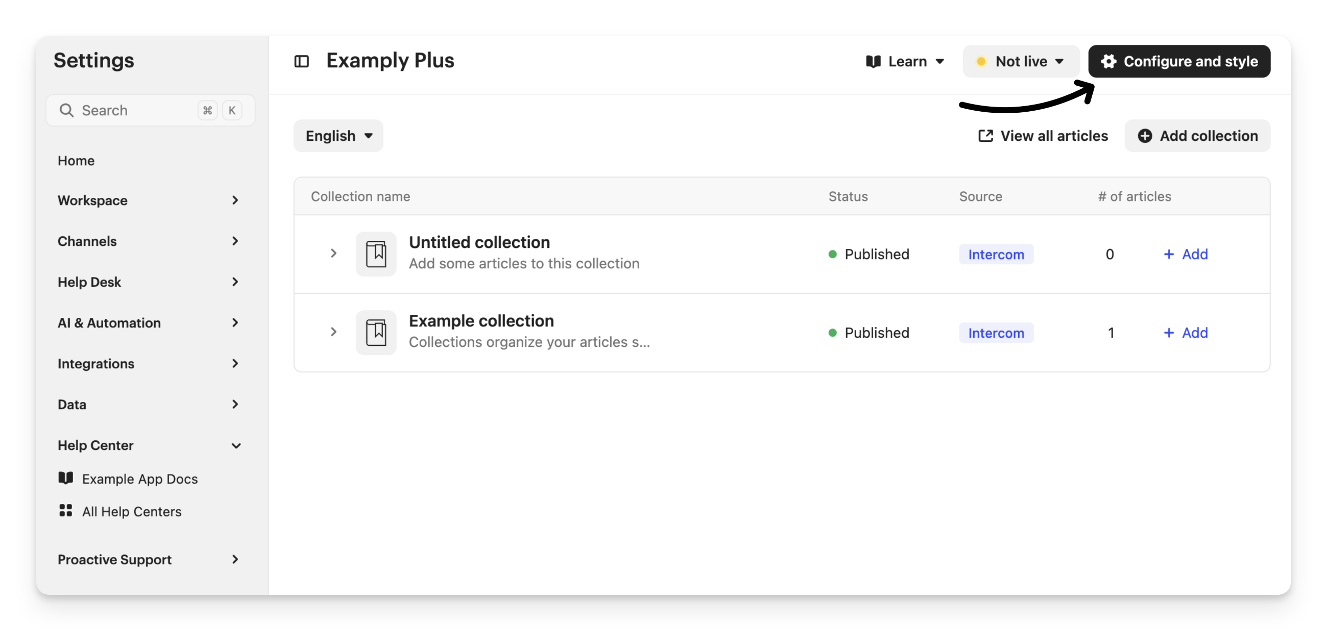 Click Save to create the Help Center. This will take you to the settings page for your new Help Center where you can click Configure and style to finish setting up and customizing.