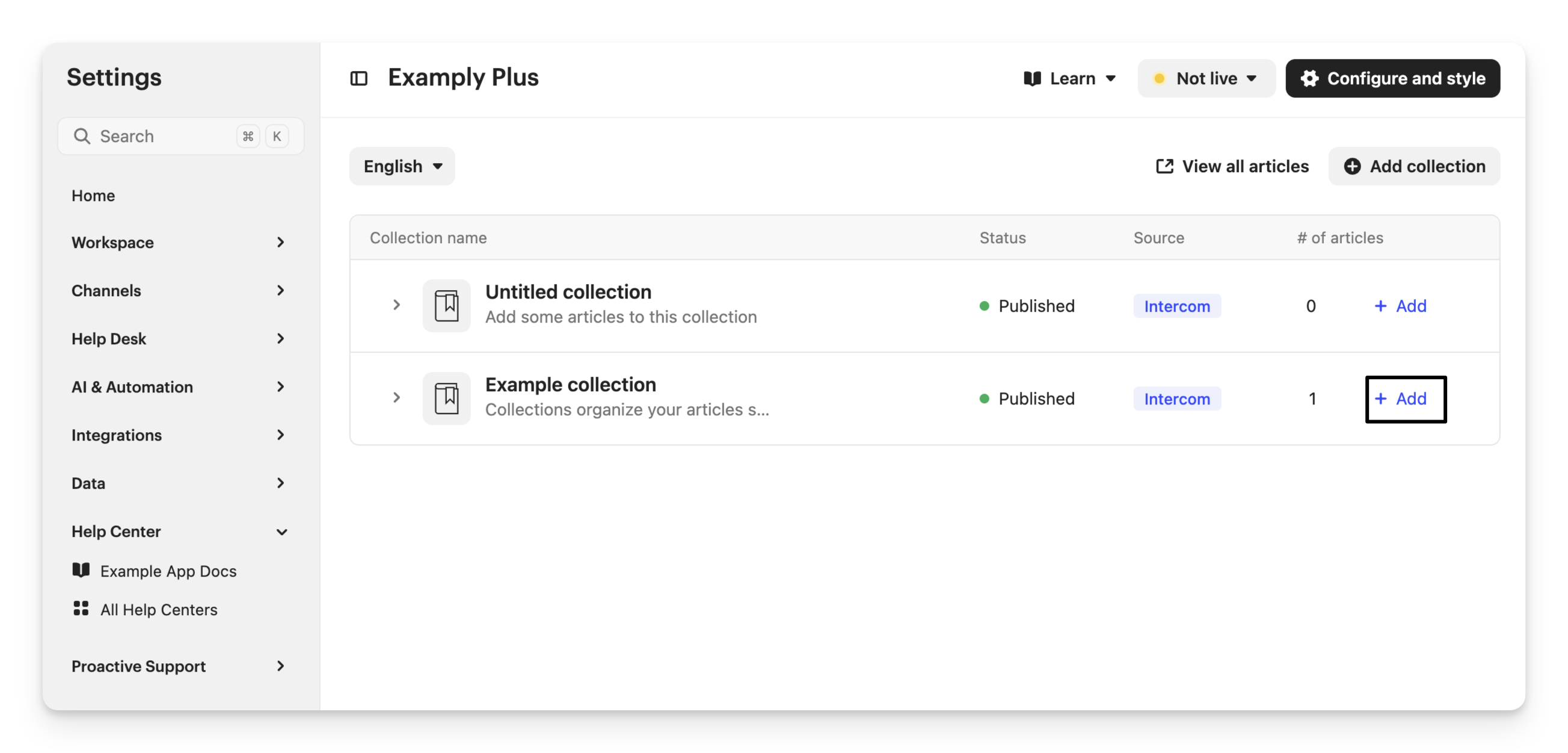 The selected Help Center will be used for the Help space, as well as the Article Search app in the Messenger.
