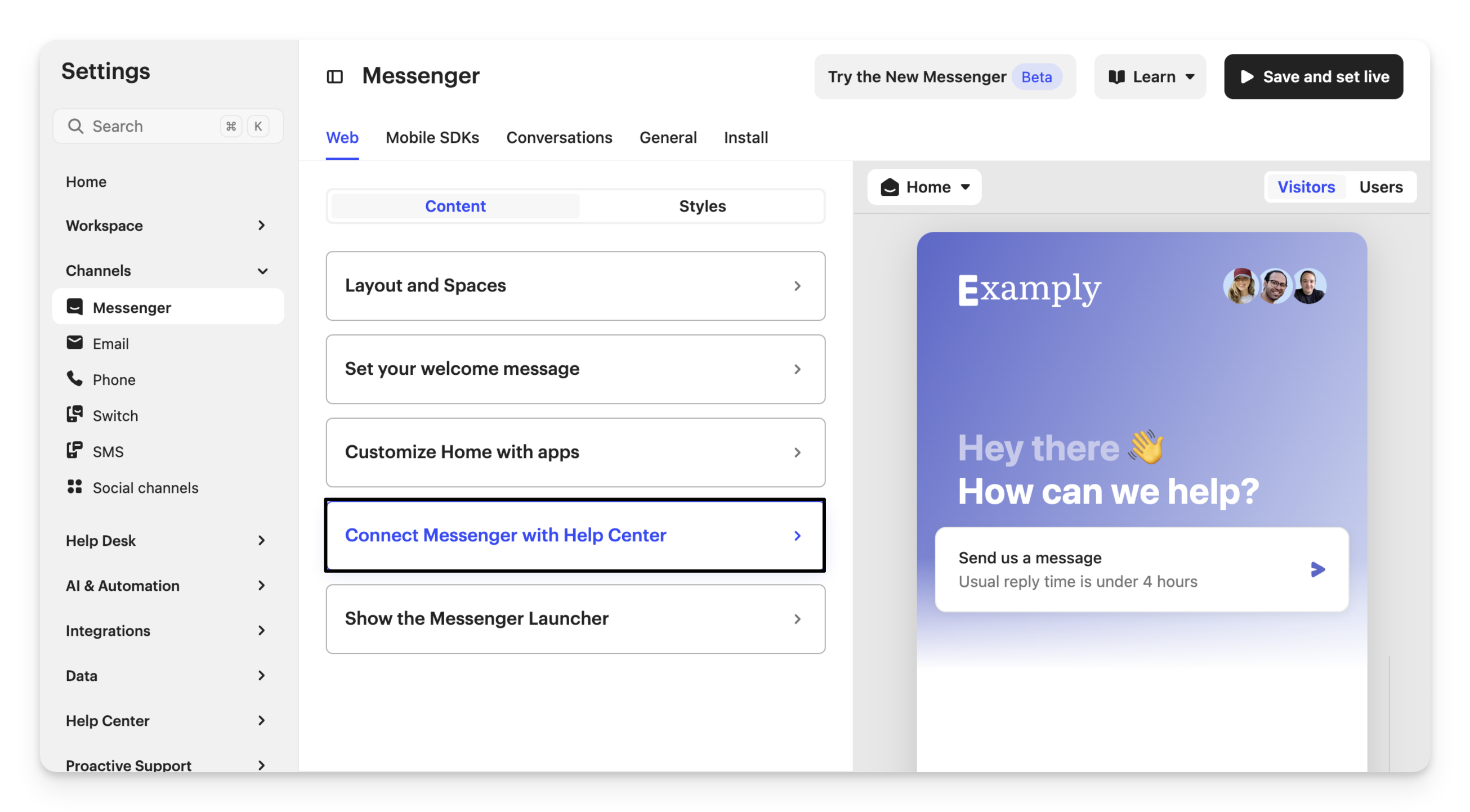 To connect a Help Center with an existing Messenger Brand, go to Settings > Channels > Messenger and open Connect Messenger with Help Center.