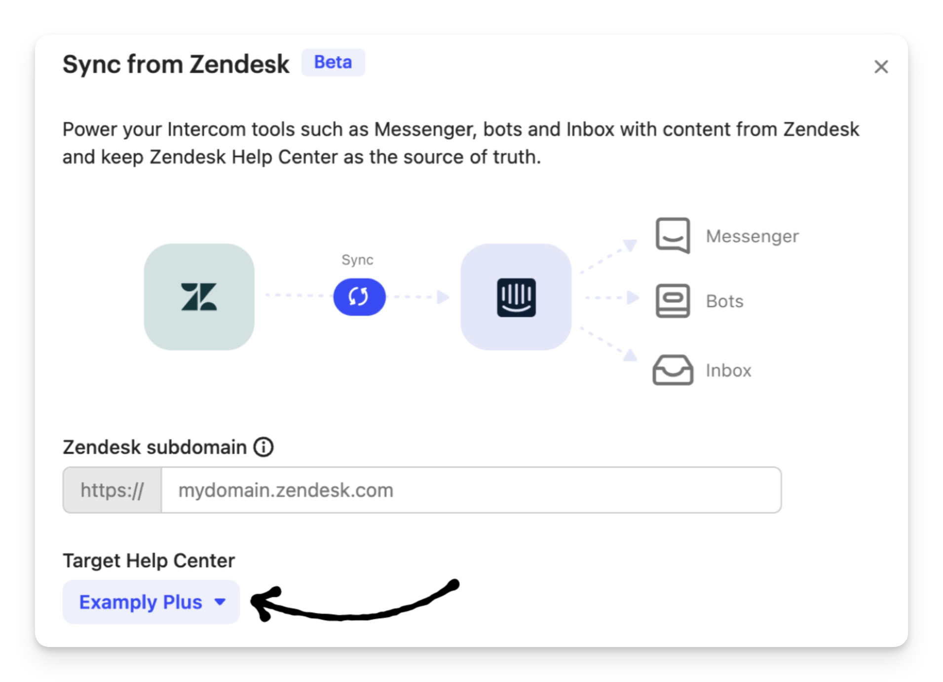 When syncing articles or migrating from Zendesk, choose the Target Help Center in Intercom where you want to add all your Zendesk articles and collections.