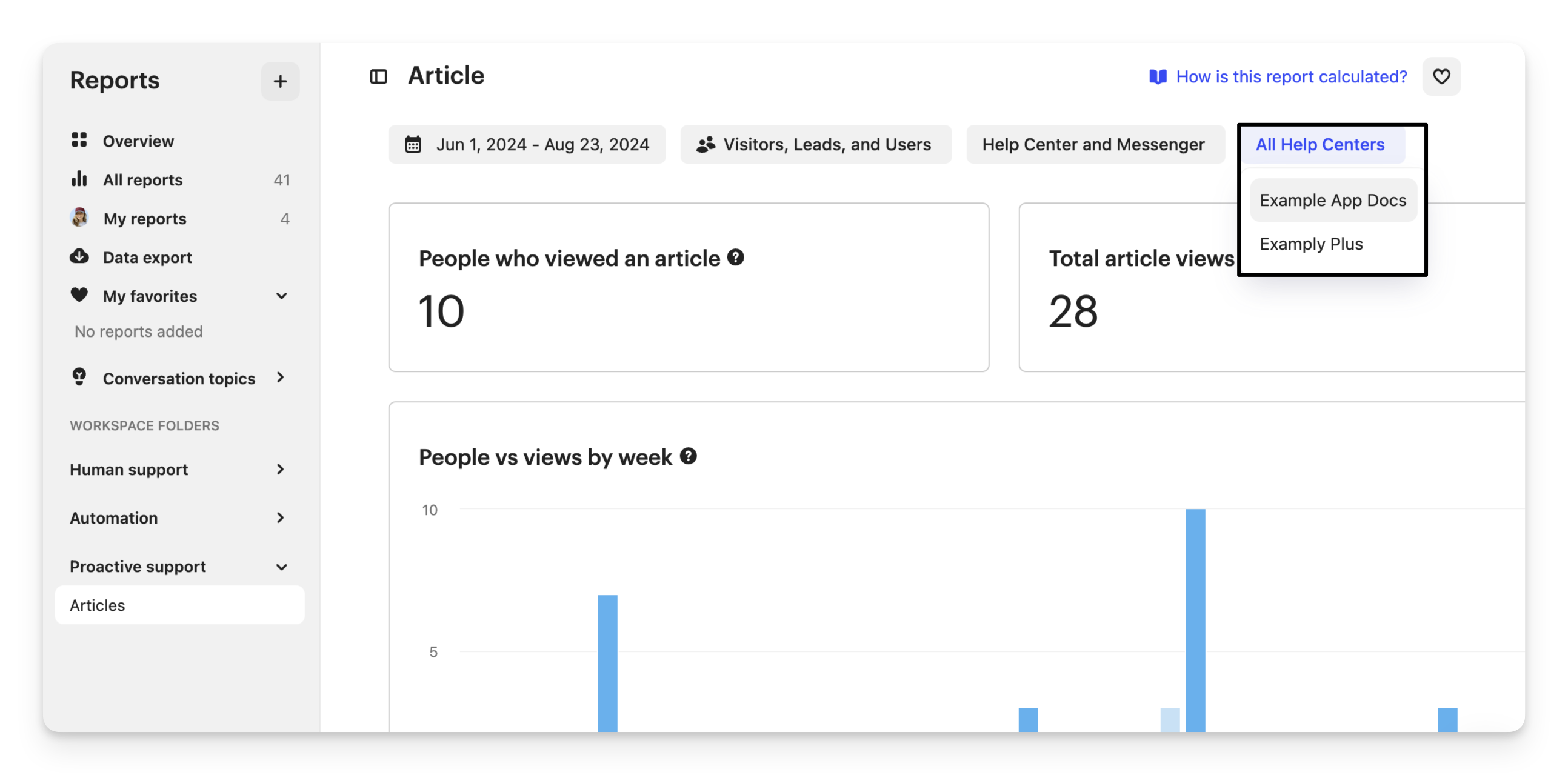 Article views, mentions and reactions can be filtered by Help Center, in addition to the "All Help Centers" filter in the Articles report.