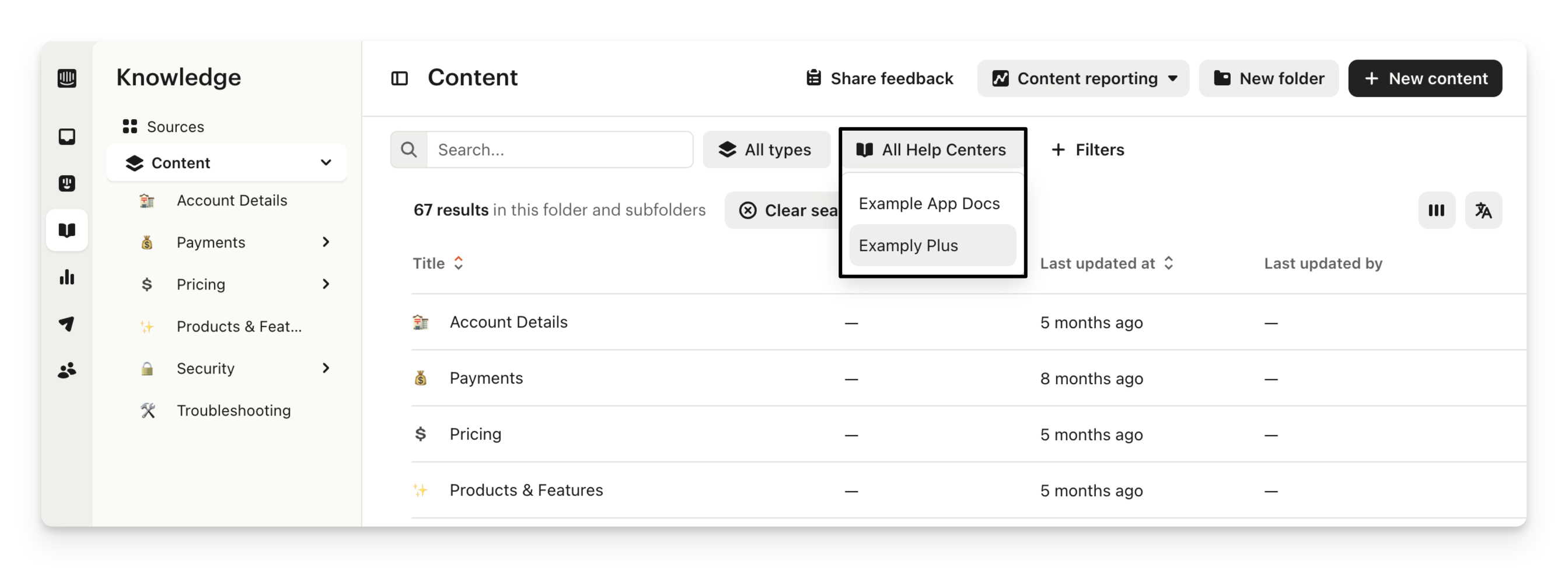 Teammates can also filter by a Help Center name, or by Unlisted articles, which are articles that belong to any Help Center and are not indexed by search engines.