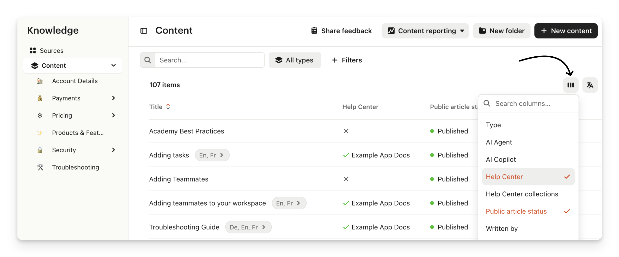 Choose to see Help Center and collections in the table view in Knowledge > Content using the Display columns picker.