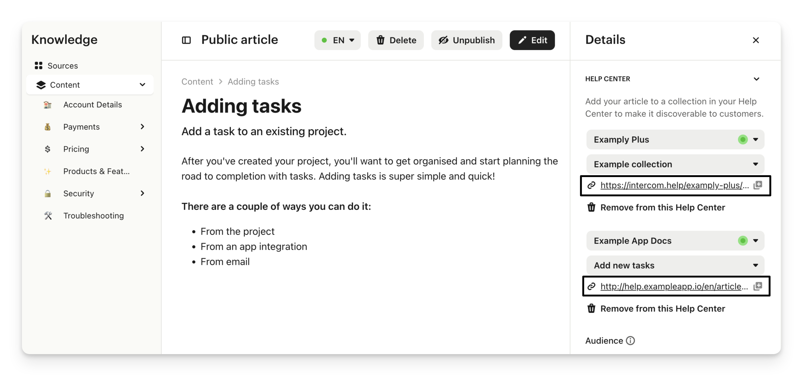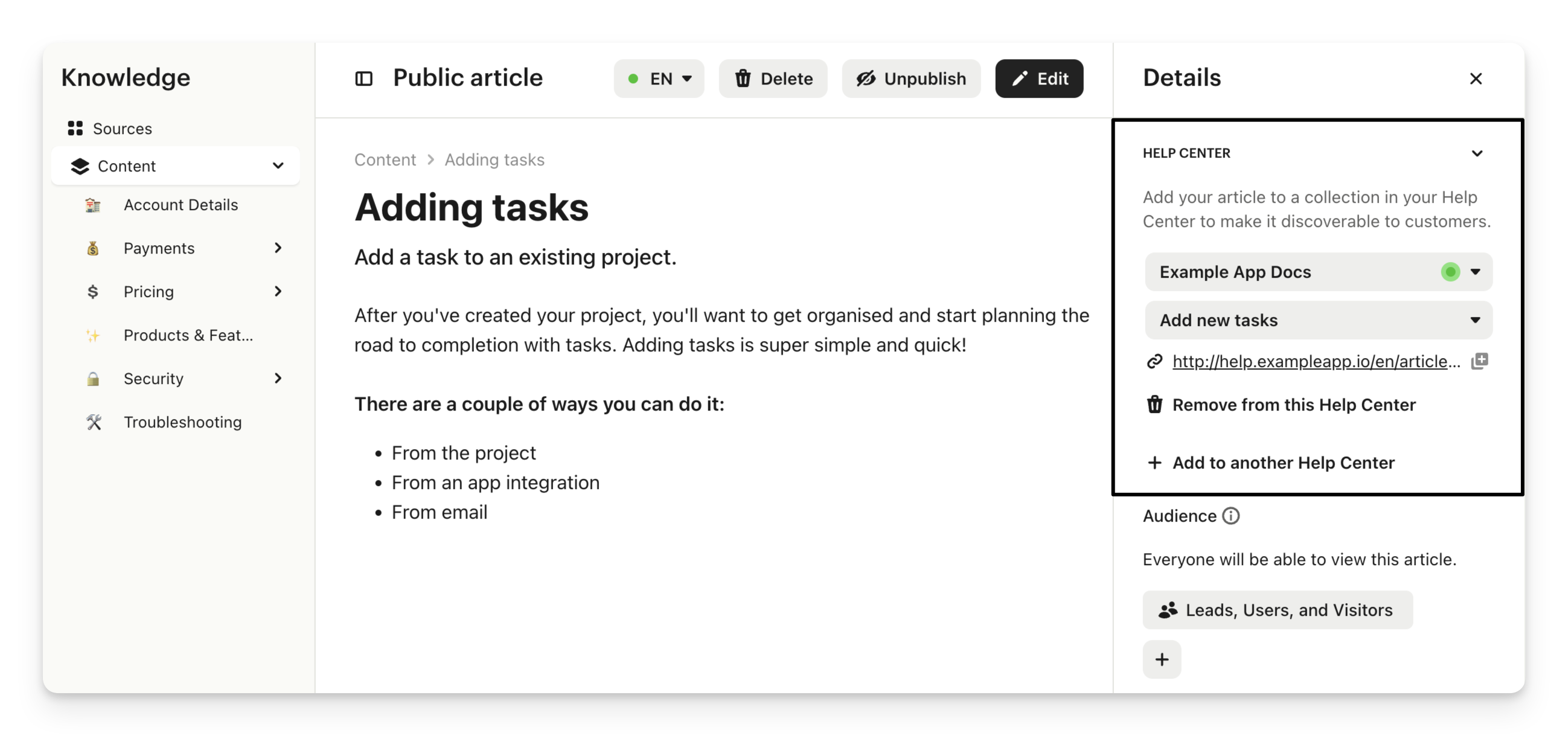 From the article editor you can choose to add an article to one or more Help Centers and collections.