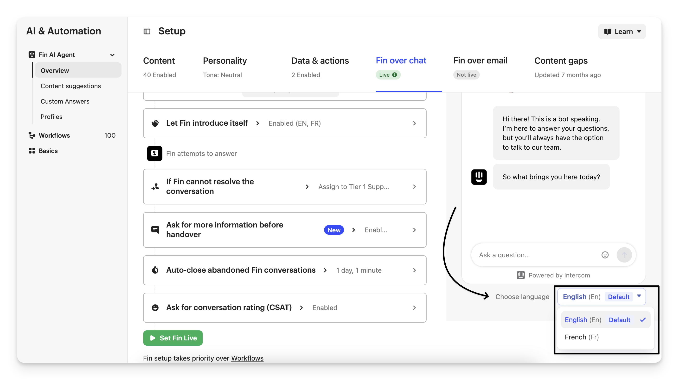 By enabling real-time translation, Fin can work in all your supported languages without needing content in each language – instead, you only need to create content in one language.