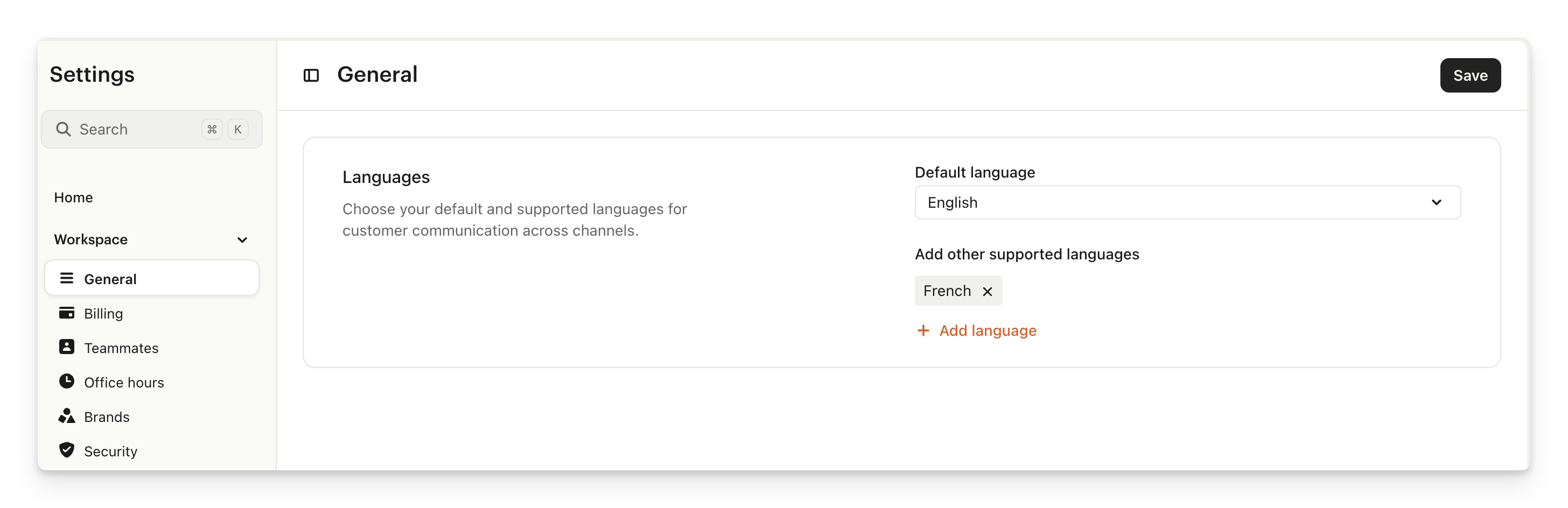 Select the languages you want Fin to support from Settings > Workspace > General.