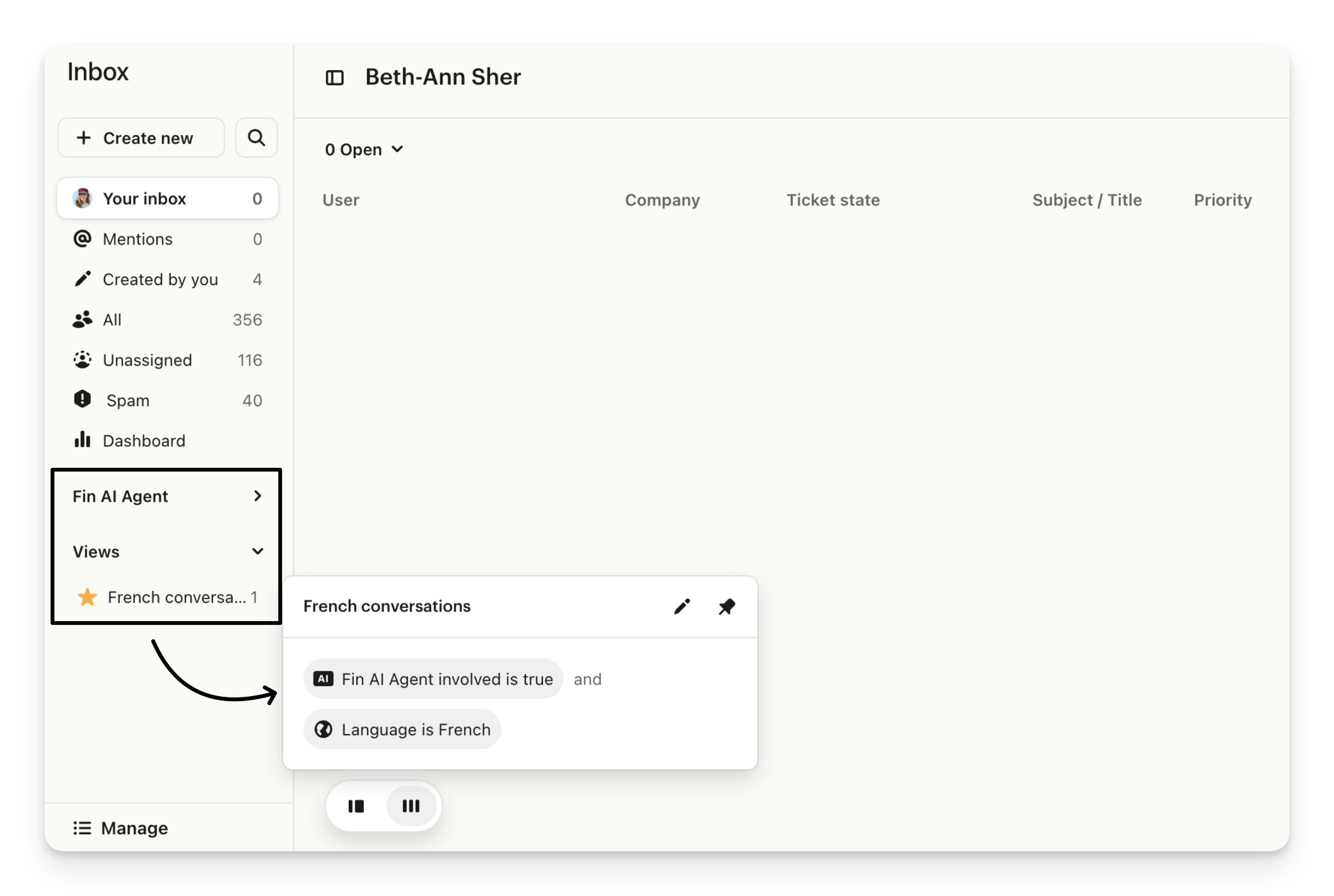 After you’ve set Fin live, a new Fin AI Agent view will automatically be created in the Inbox and pinned to all teammates’ lists.