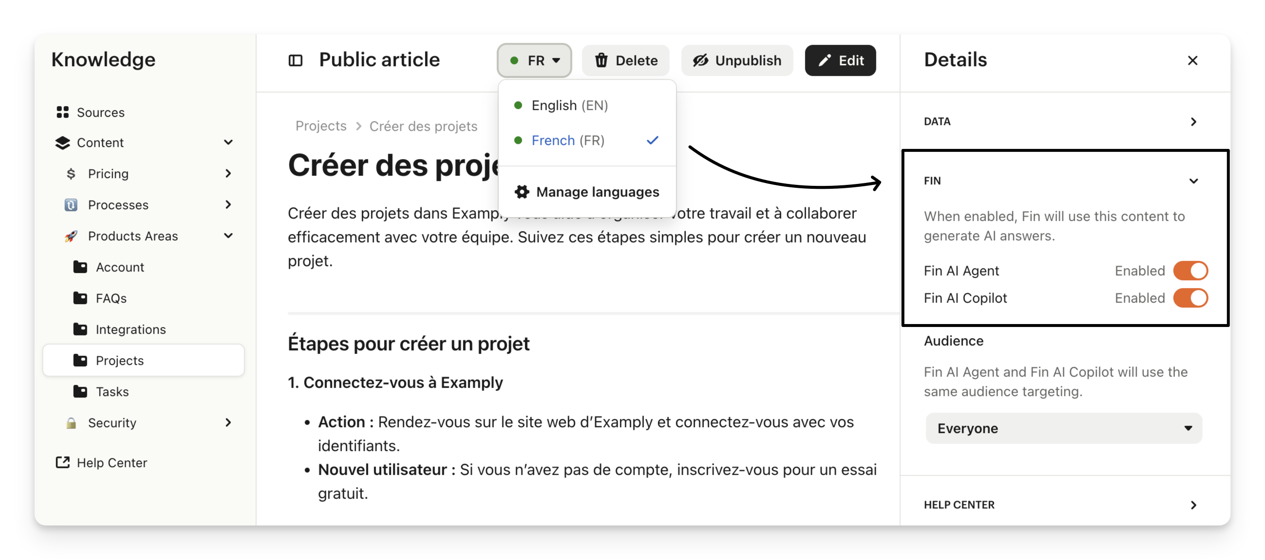 Go to Knowledge > Content and add content in the languages you want Fin to support. Make sure you've enabled it for Fin AI Agent.