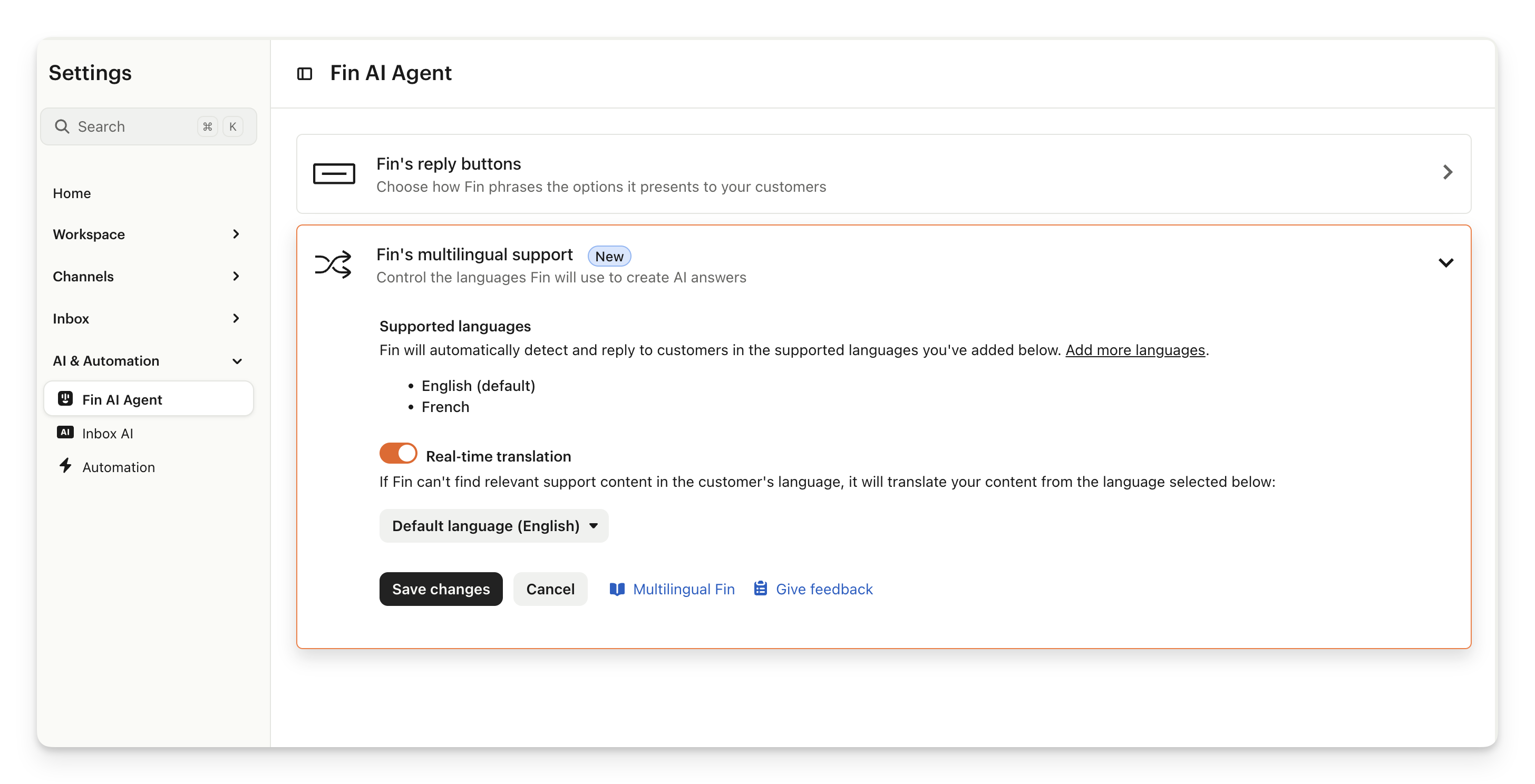 Go to Settings > AI & Automation > Fin AI Agent > Fin’s multilingual support and enable "Real-time translation". Then in the dropdown menu, select the language of the content you want Fin to translate into other languages, and save your changes. The Default language option is your workspace's default language.