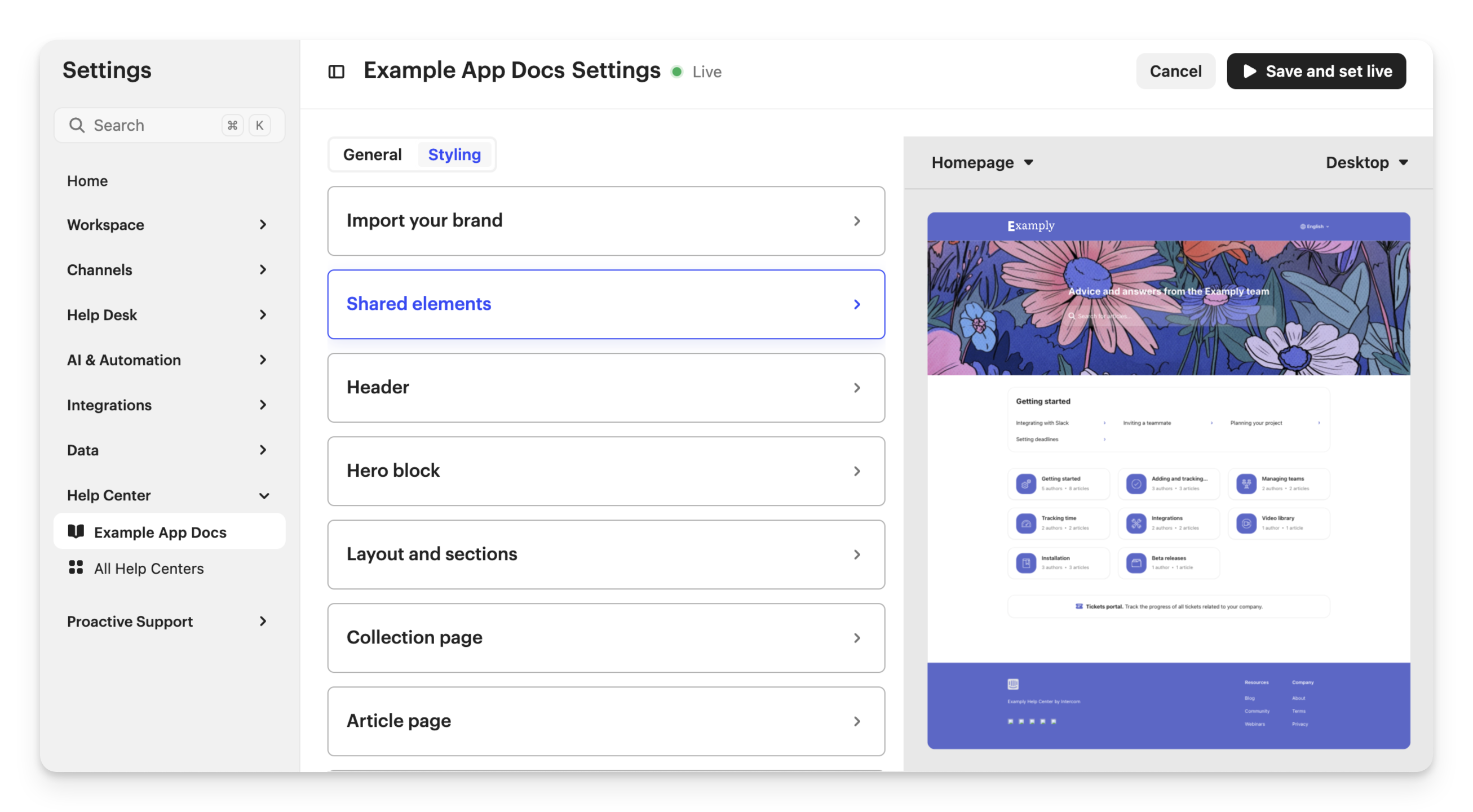 Go to Settings > Help Center > Configure & style and open the Styling tab then click on Shared elements.