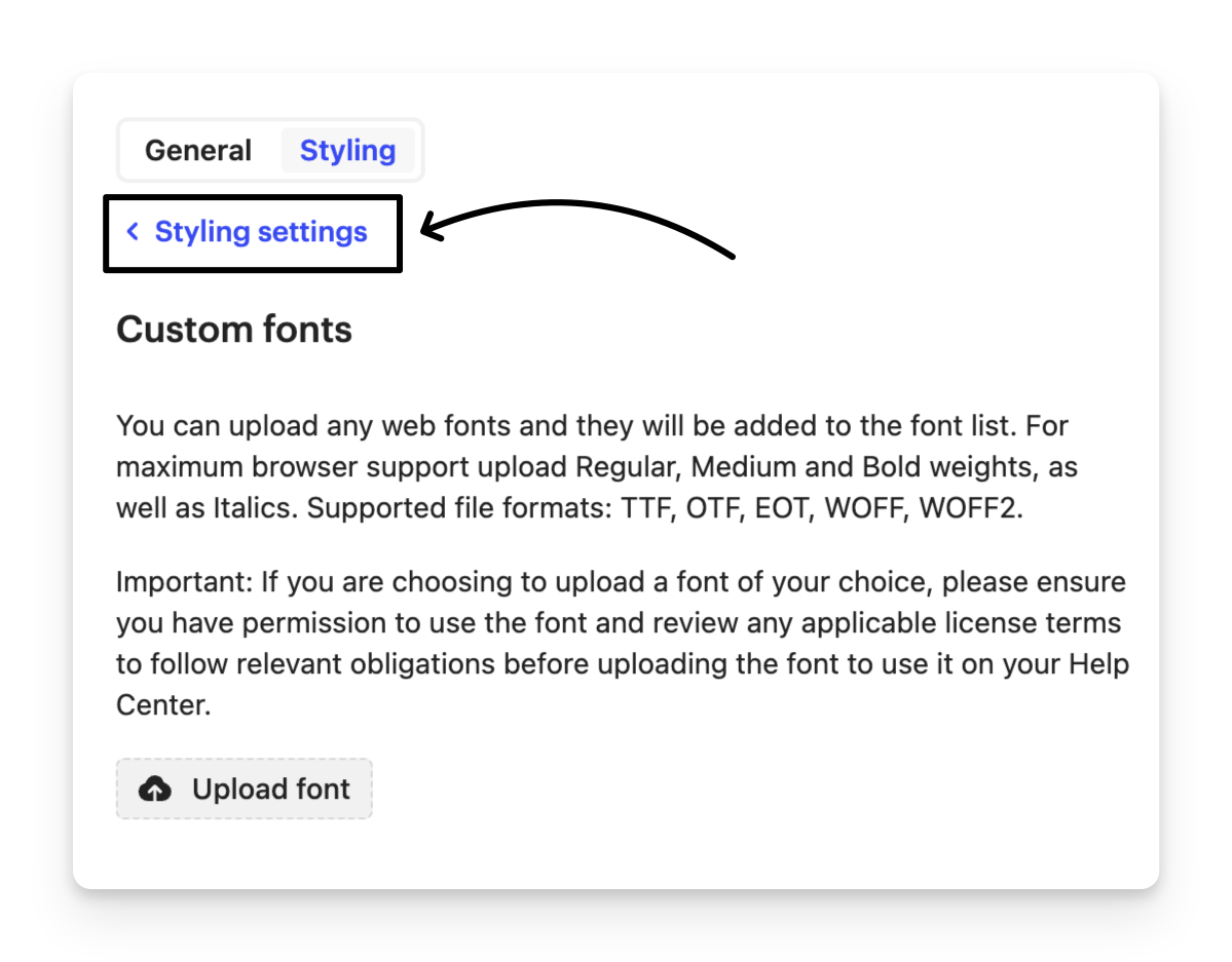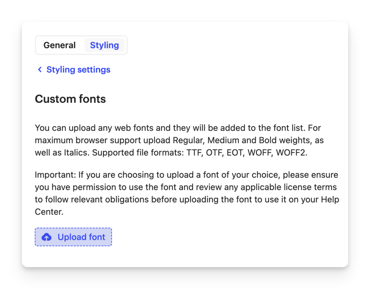 If you are choosing to upload a font of your choice, please ensure you have permission to use the font and review any applicable license terms to follow relevant obligations before uploading the font to use it on your Help Center.