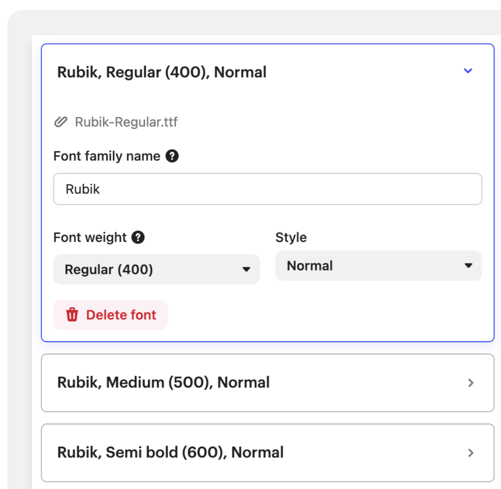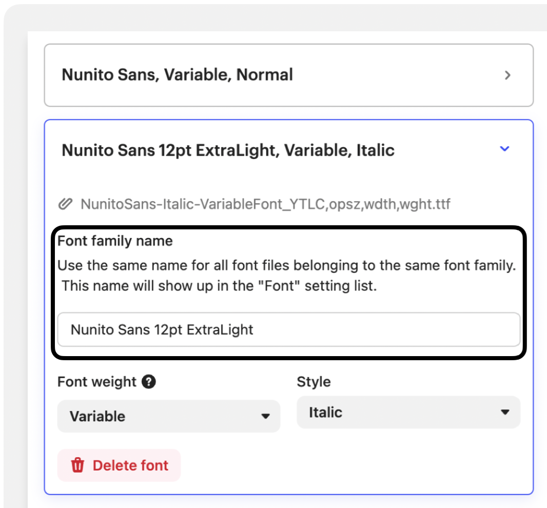 If you use Google Fonts (preloaded), these settings are applied automatically and no extra steps are needed. But when using a custom font, you must upload multiple font files for each font weight and ensure all settings are correct (the only exception is Variable fonts).