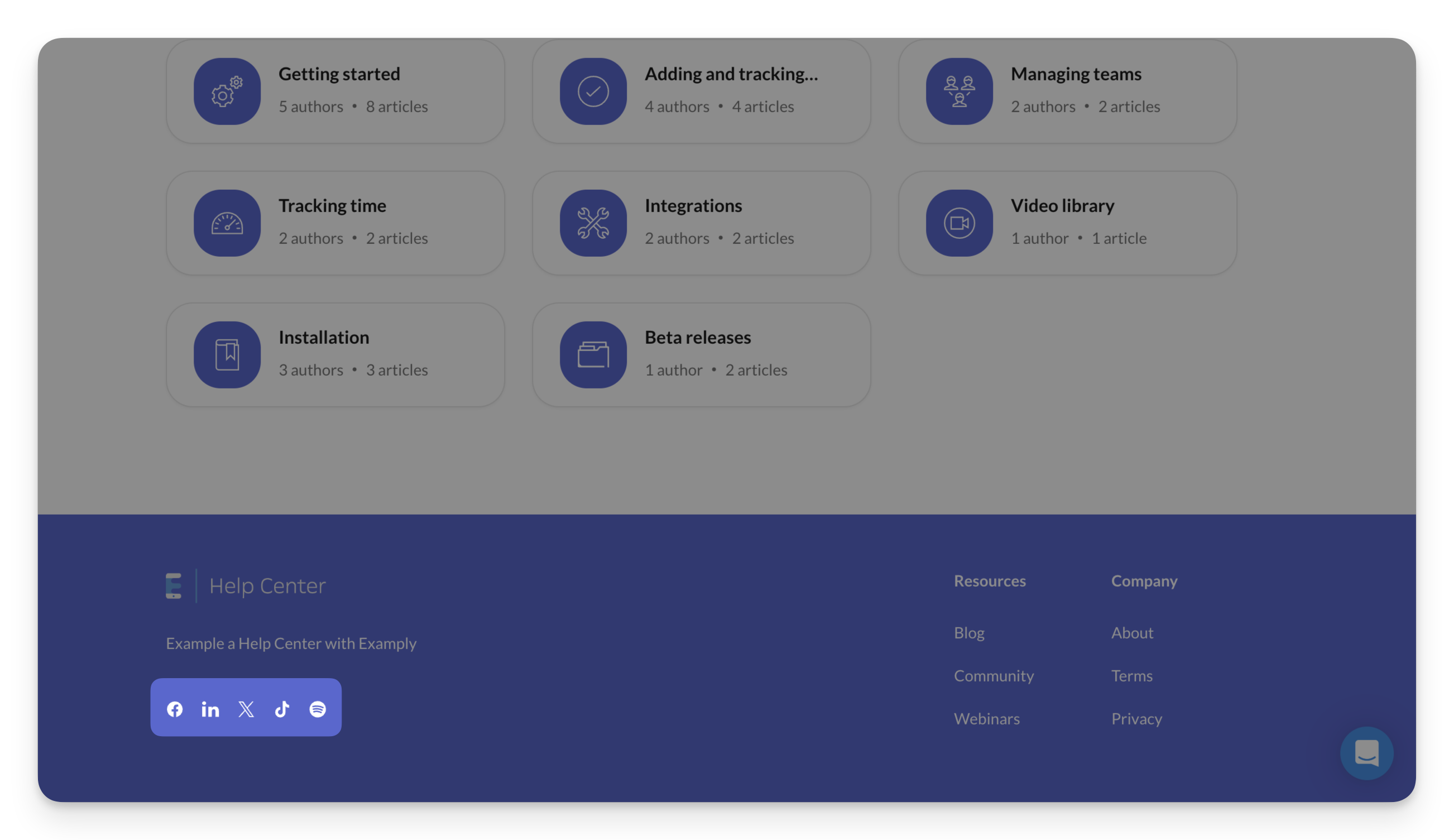 Link to social media from your Help Center footer by adding your handle for up to 16 common social platforms by going to Settings > Help Center > Configure & style and navigating to the Styling > Footer section.
