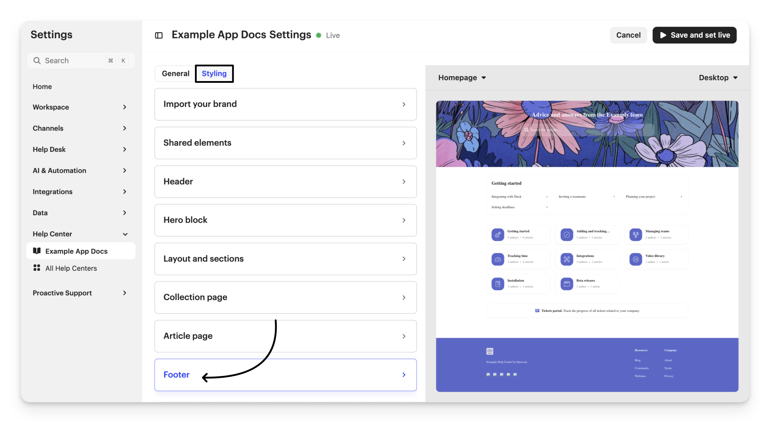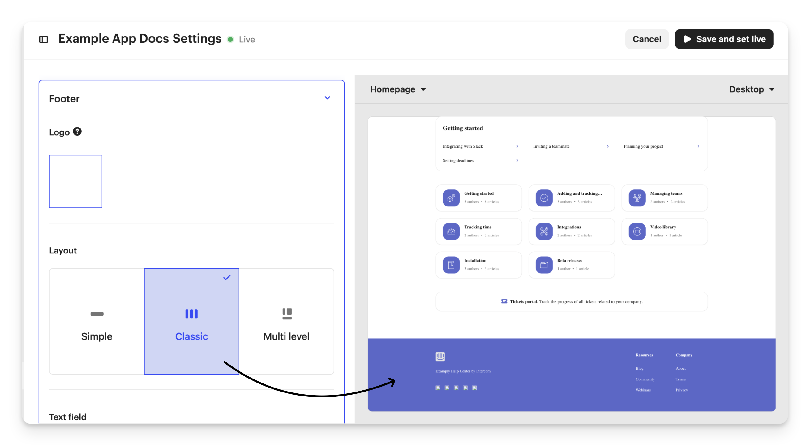 Changes made in the composer are also reflected in the Help Center preview so you can see how your footer content appears before selecting Save and set live.