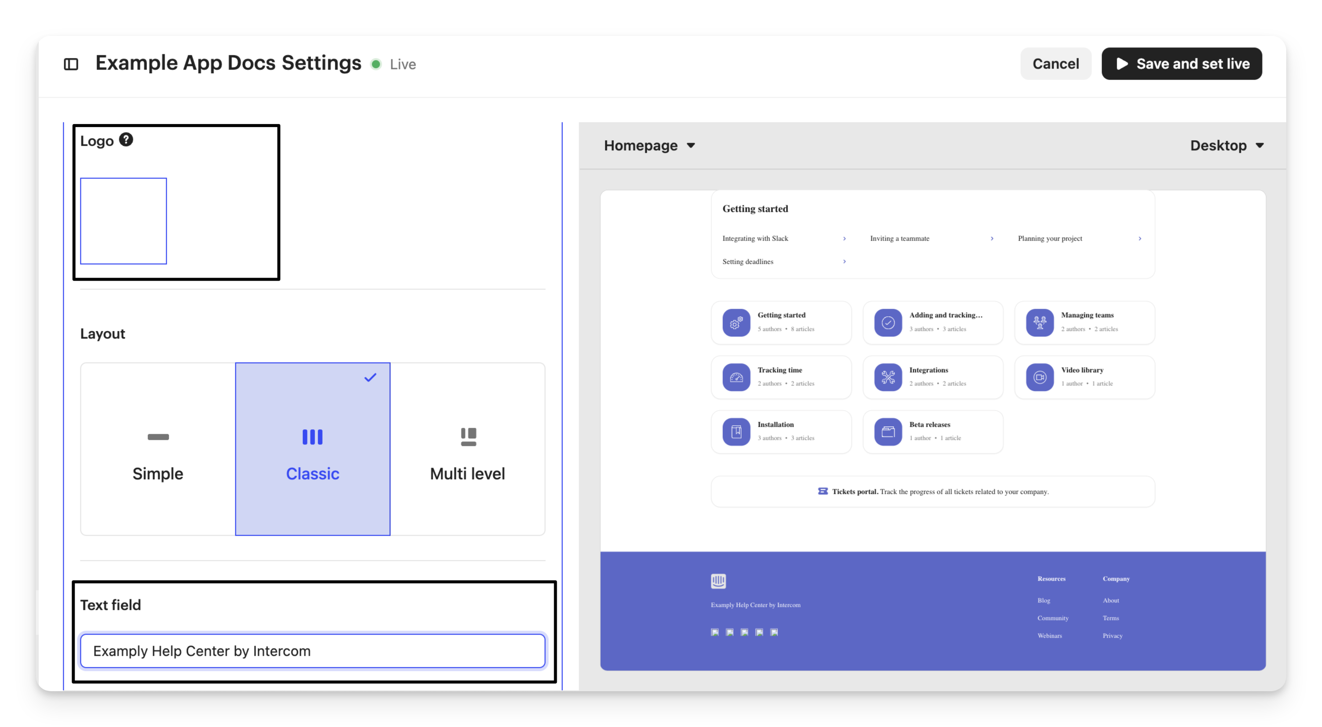 Once you've uploaded a logo or edited the text field, click Save and set live to save your changes to the Help Center.