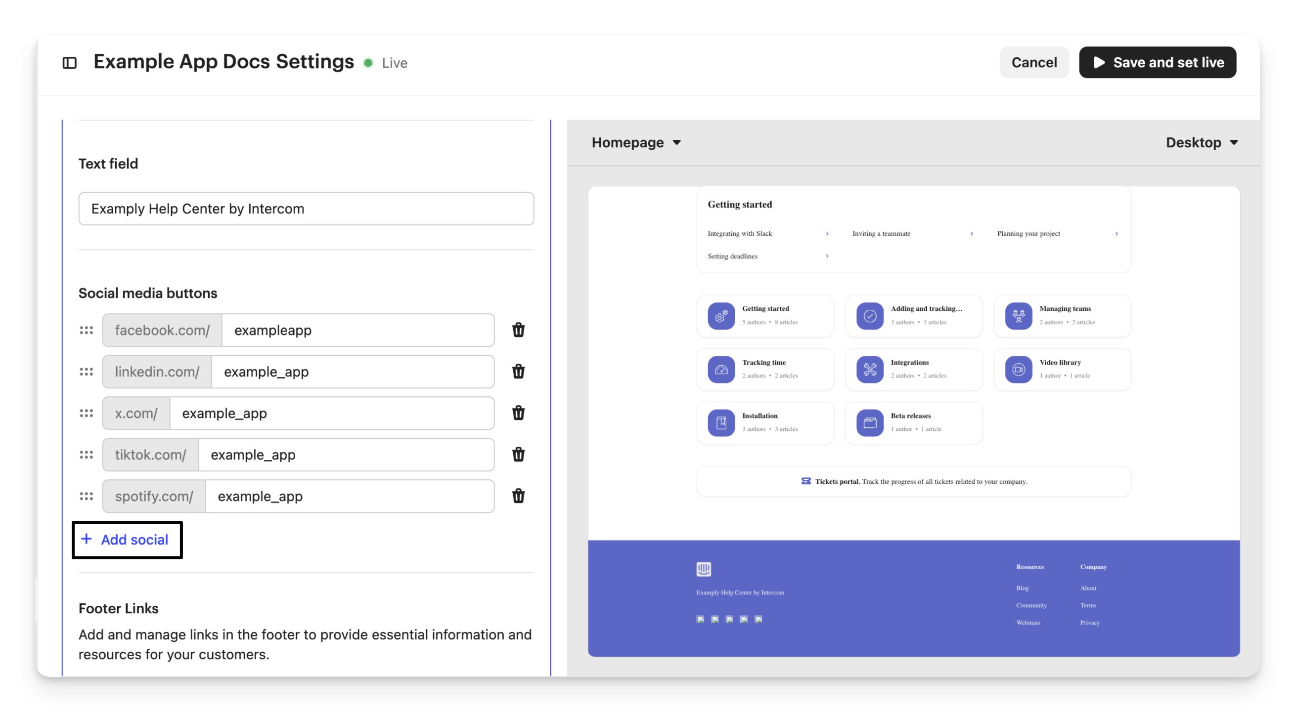 Once you've added Social media buttons, click Save and set live to save your changes to the Help Center.