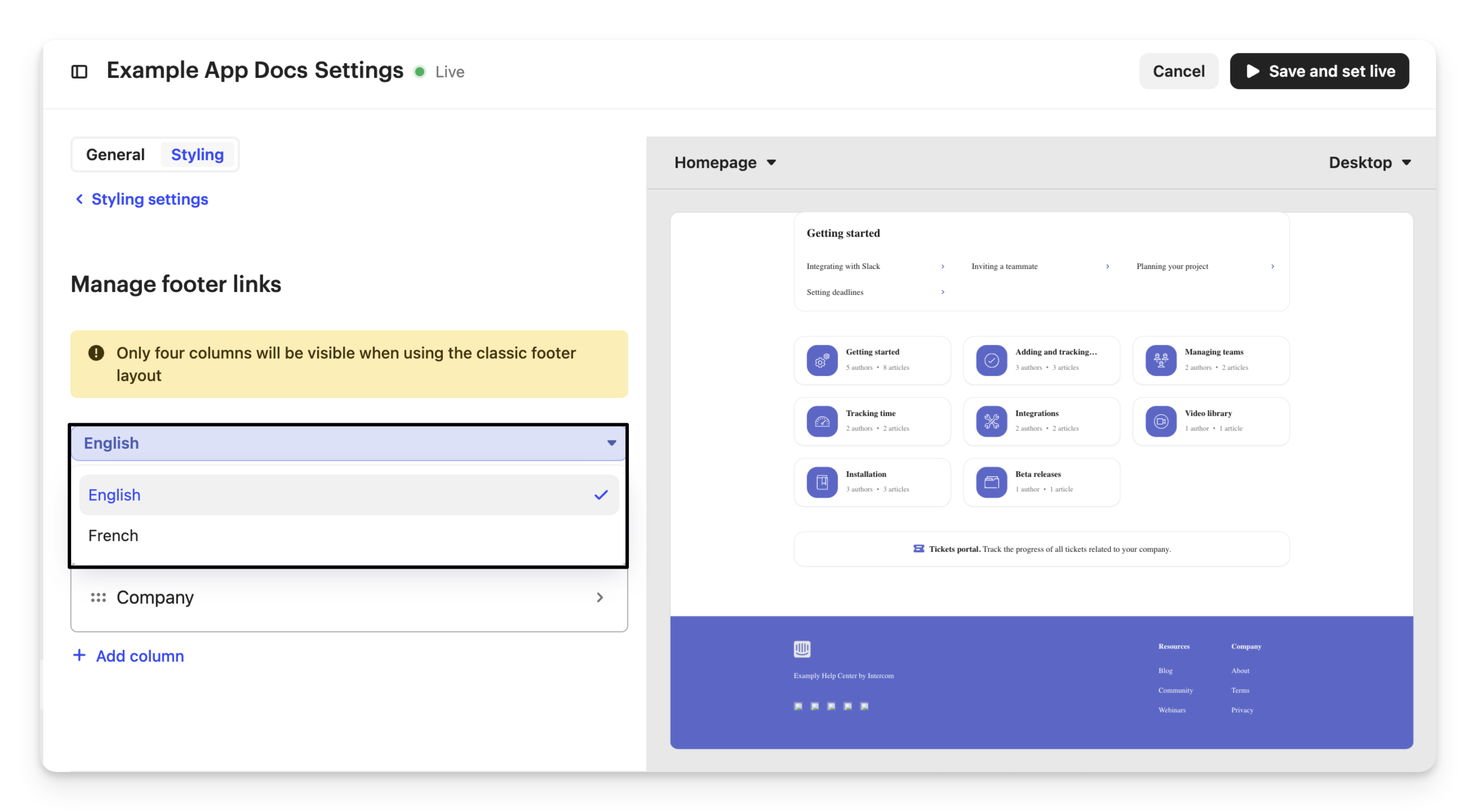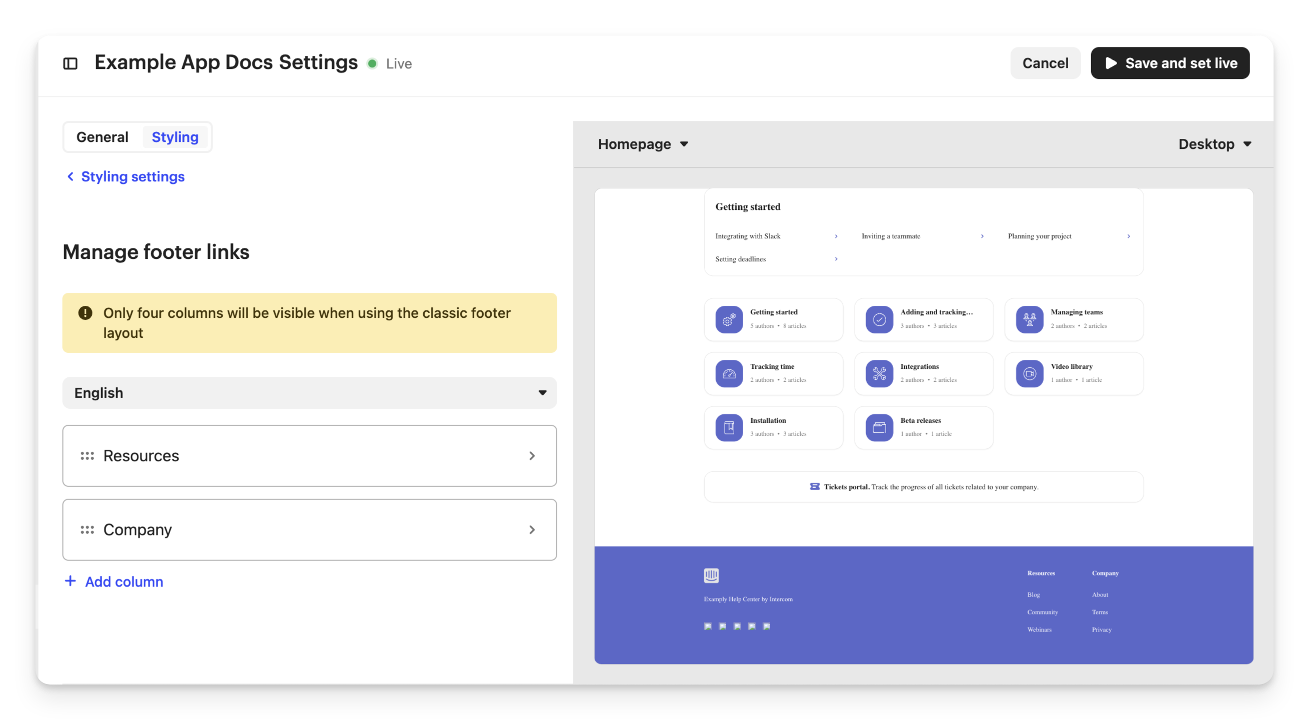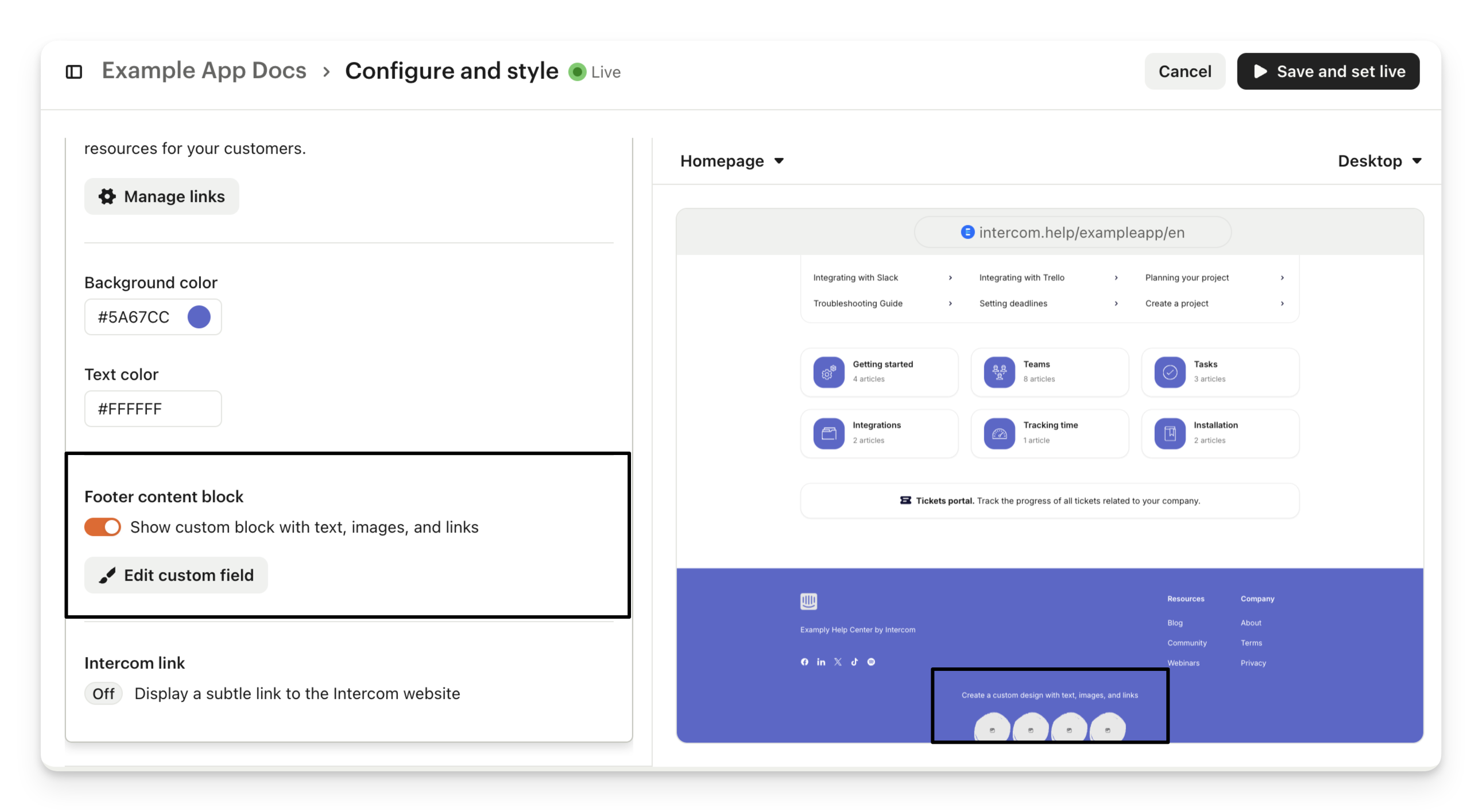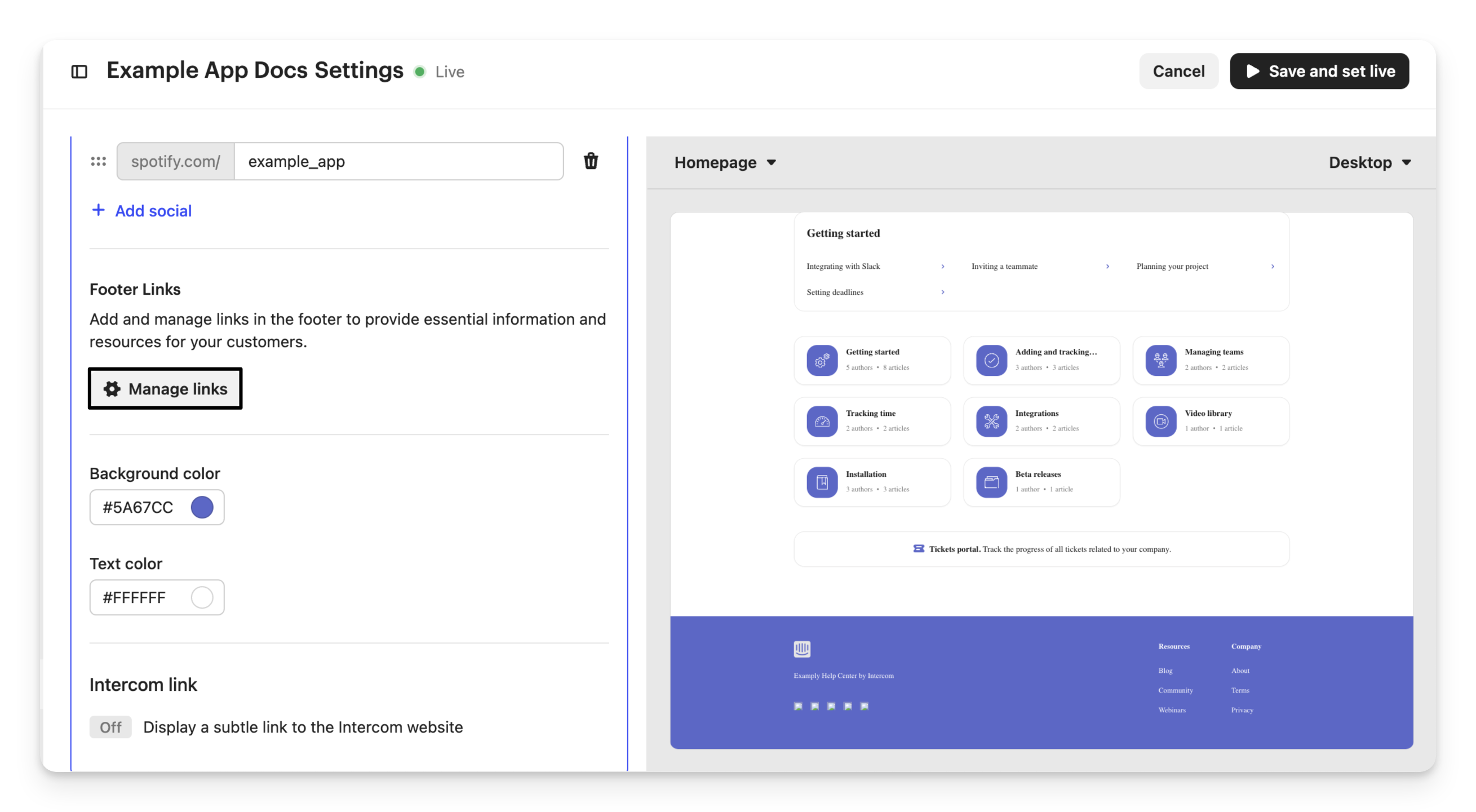 Once you've finished managing your footer links, click Save and set live to save your changes to the Help Center.