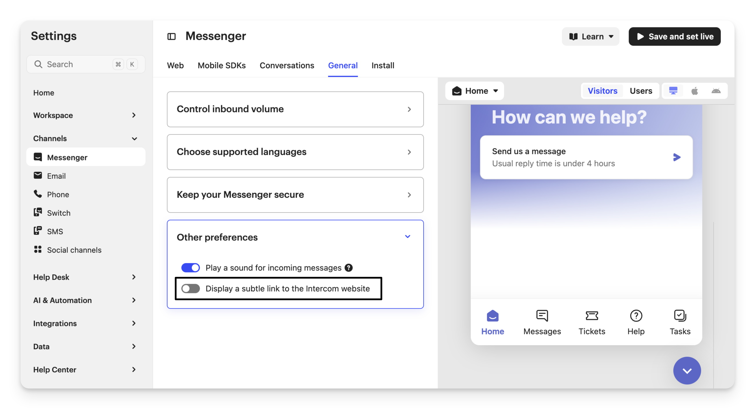 Display a subtle link to the Intercom website on your Help Center footer. This setting is controlled by your Messenger preferences.