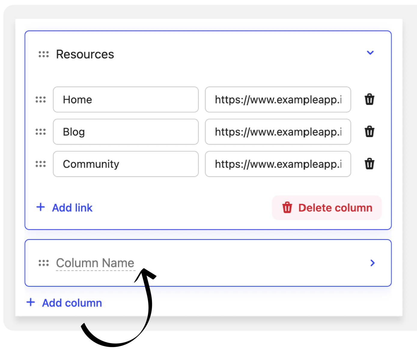 You can group links together by creating columns. To create a column give the column a name (this is optional) and use the dropdown arrow on the right to start adding the labels and URLs for each footer link below that column.