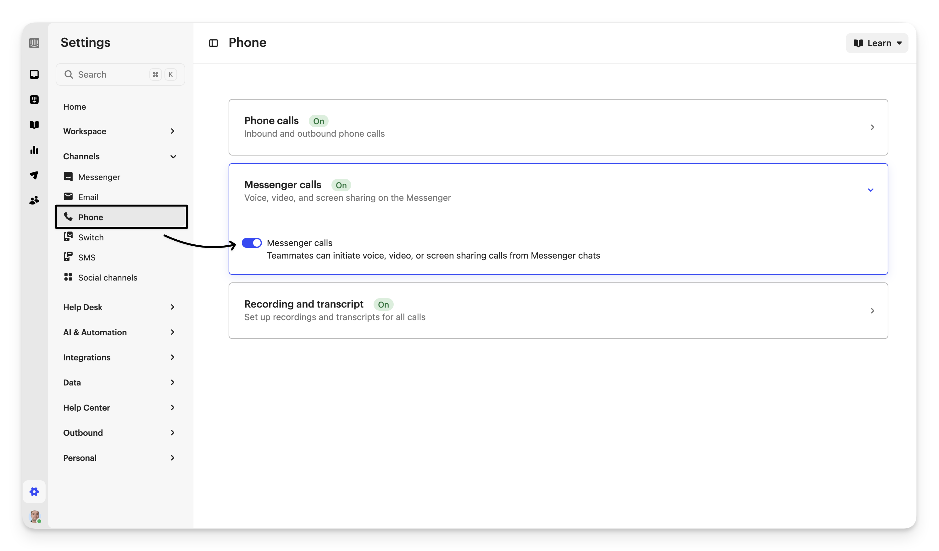Enabling Messenger calls allows teammates to initiate voice, video, or screen sharing calls from Messenger chats.