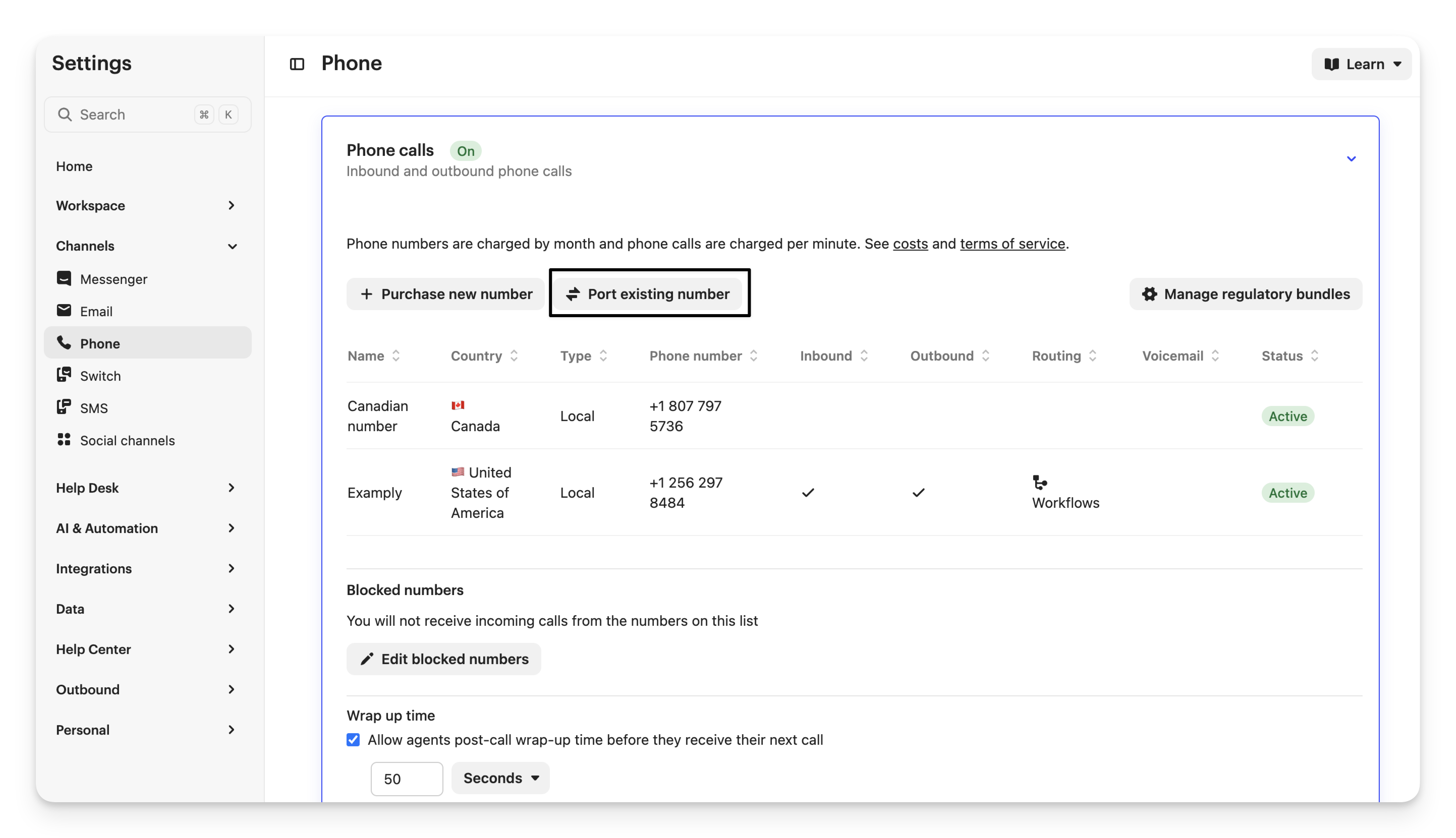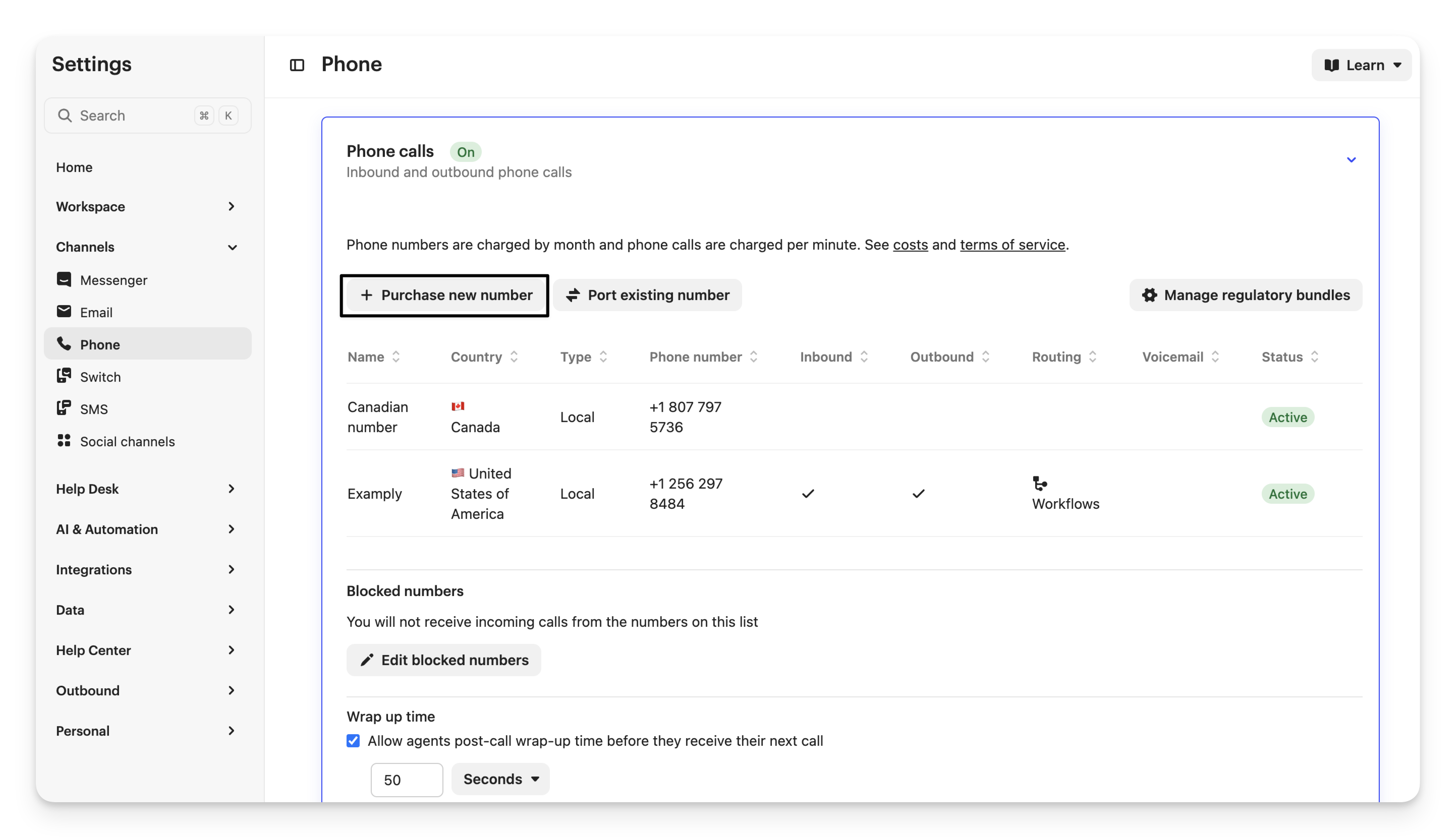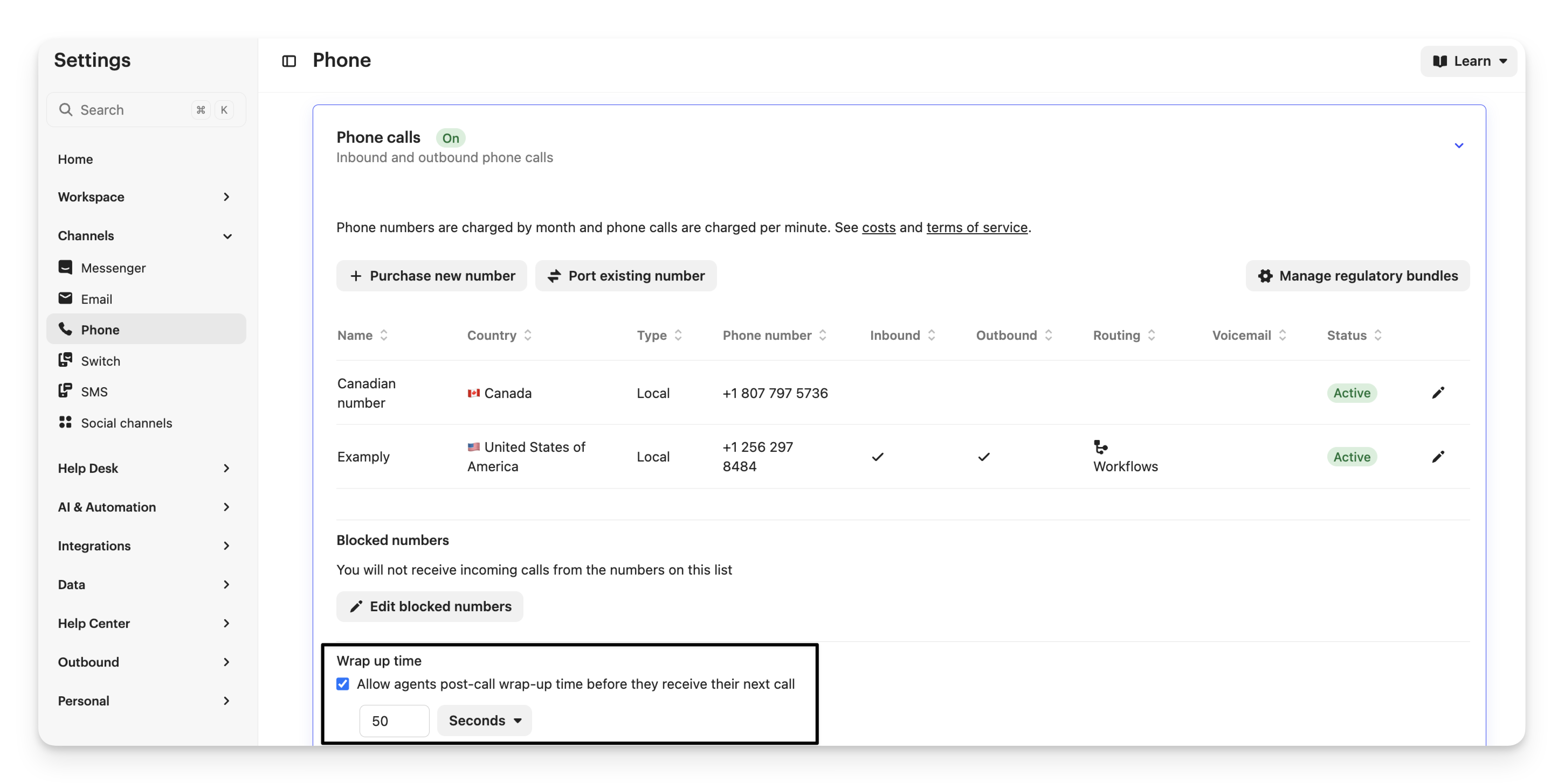 If you’d like to give teammates time to wrap up after a call before they can receive another call, go to Settings > Channels > Phone and open the Phone calls section.