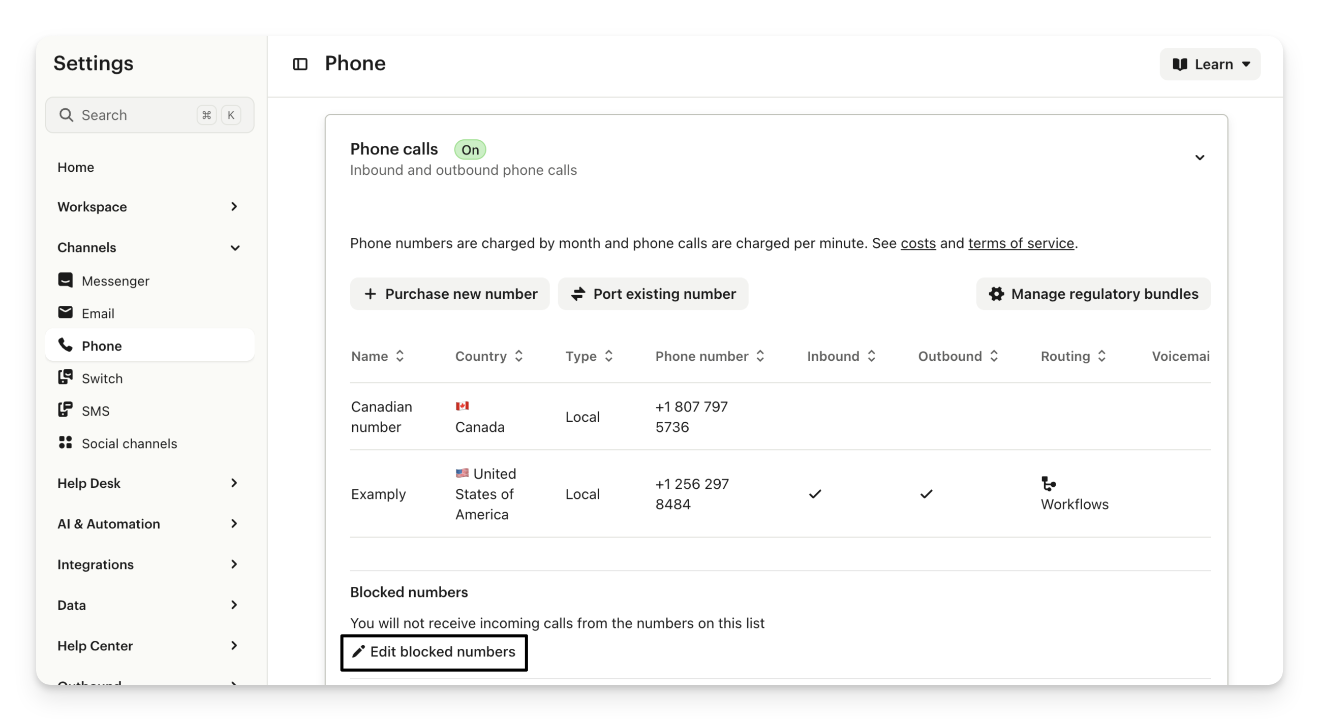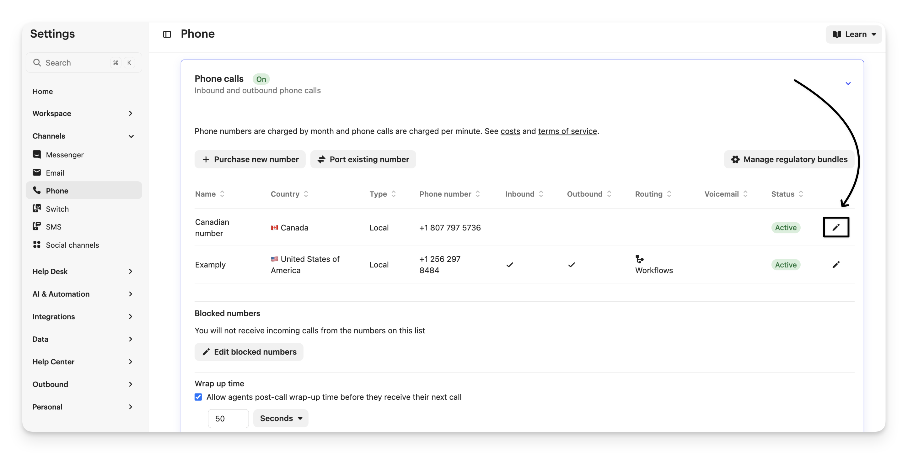 After you’ve ported an existing number into Intercom, or activated a new number, you’ll need to configure the phone number settings found in Settings > Channels > Phone under Phone calls (scroll across to the end of the row).