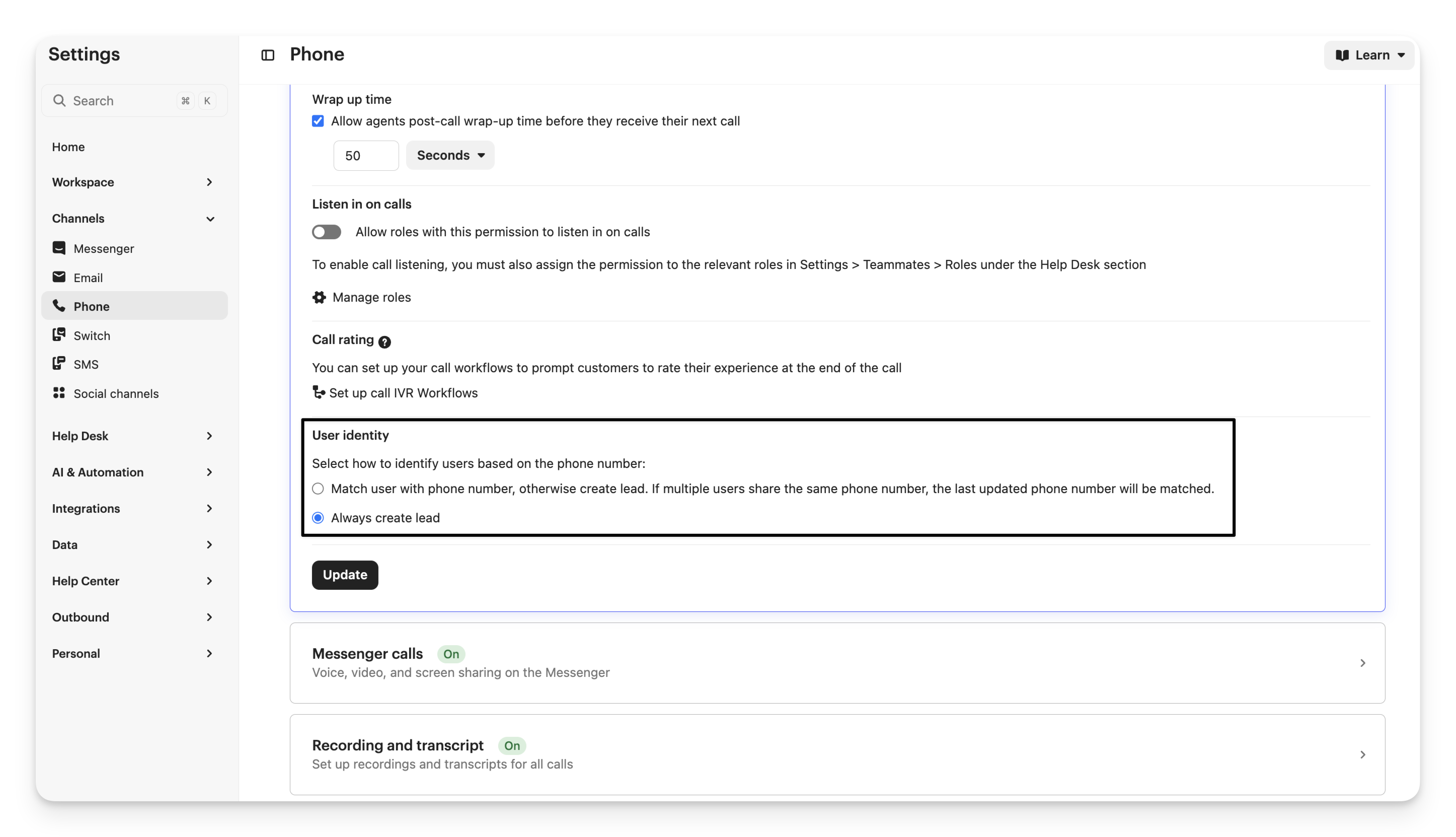 To identify users based on their phone number for inbound calls, go to Settings > Channels > Phone and open the Phone calls section.