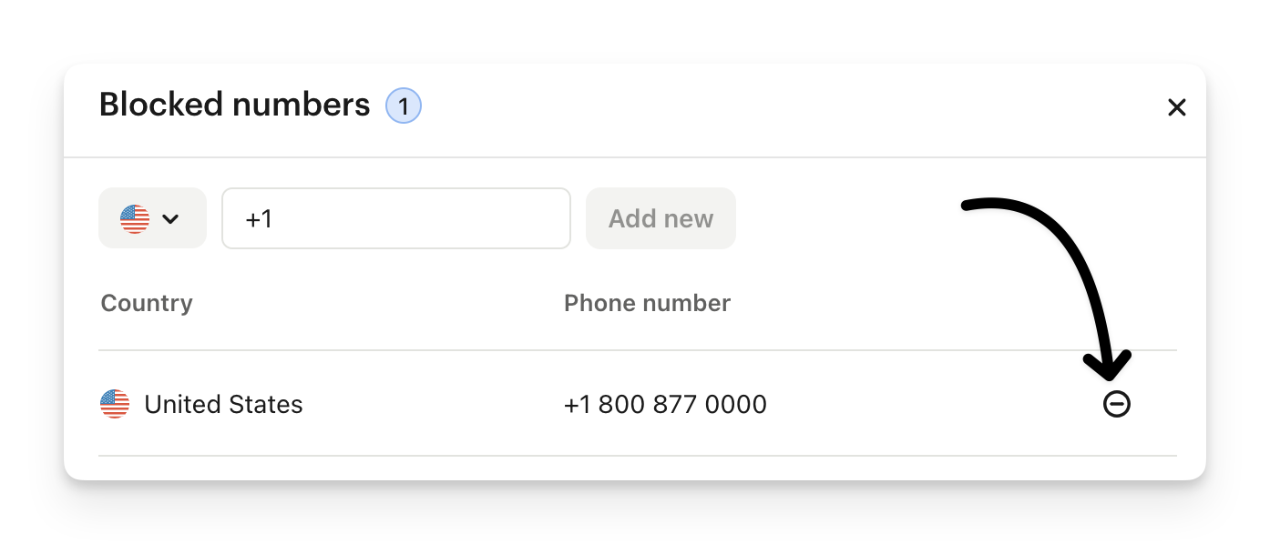 If you want to unblock the number again, you can press the icon to the right of its row in the Blocked numbers table. This will remove the number from the list and it will be able to make inbound calls again.