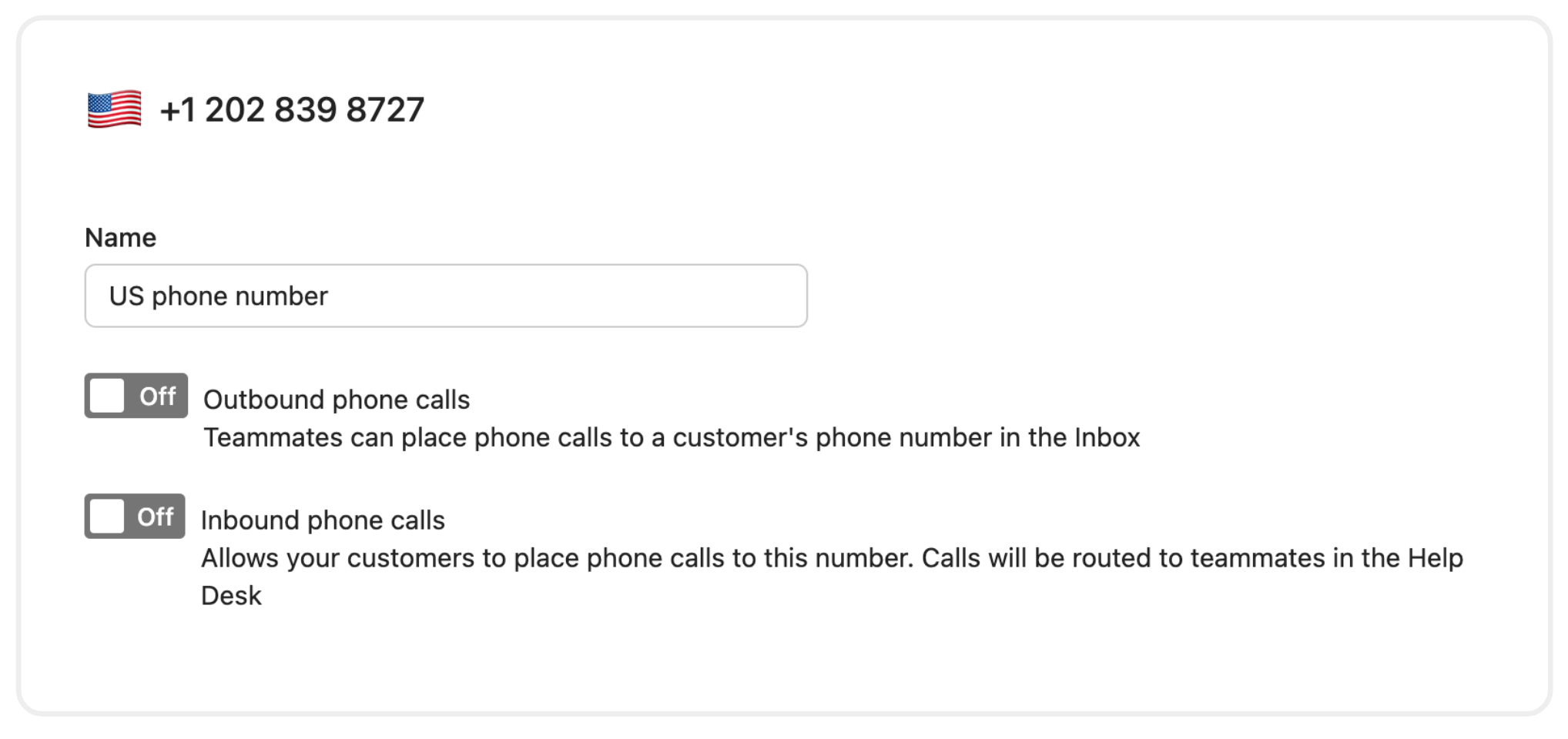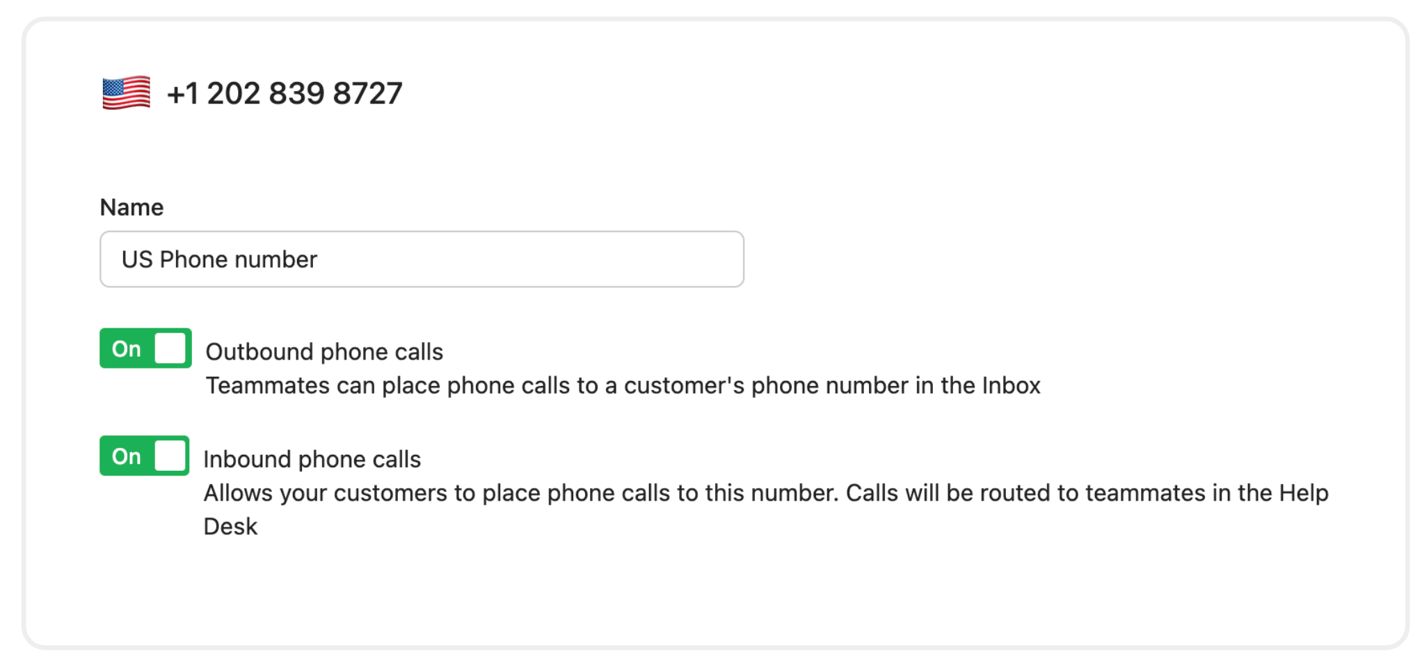 Inbound phone calls - allows customers to place phone calls to this number which will be routed to teammates in the Inbox.