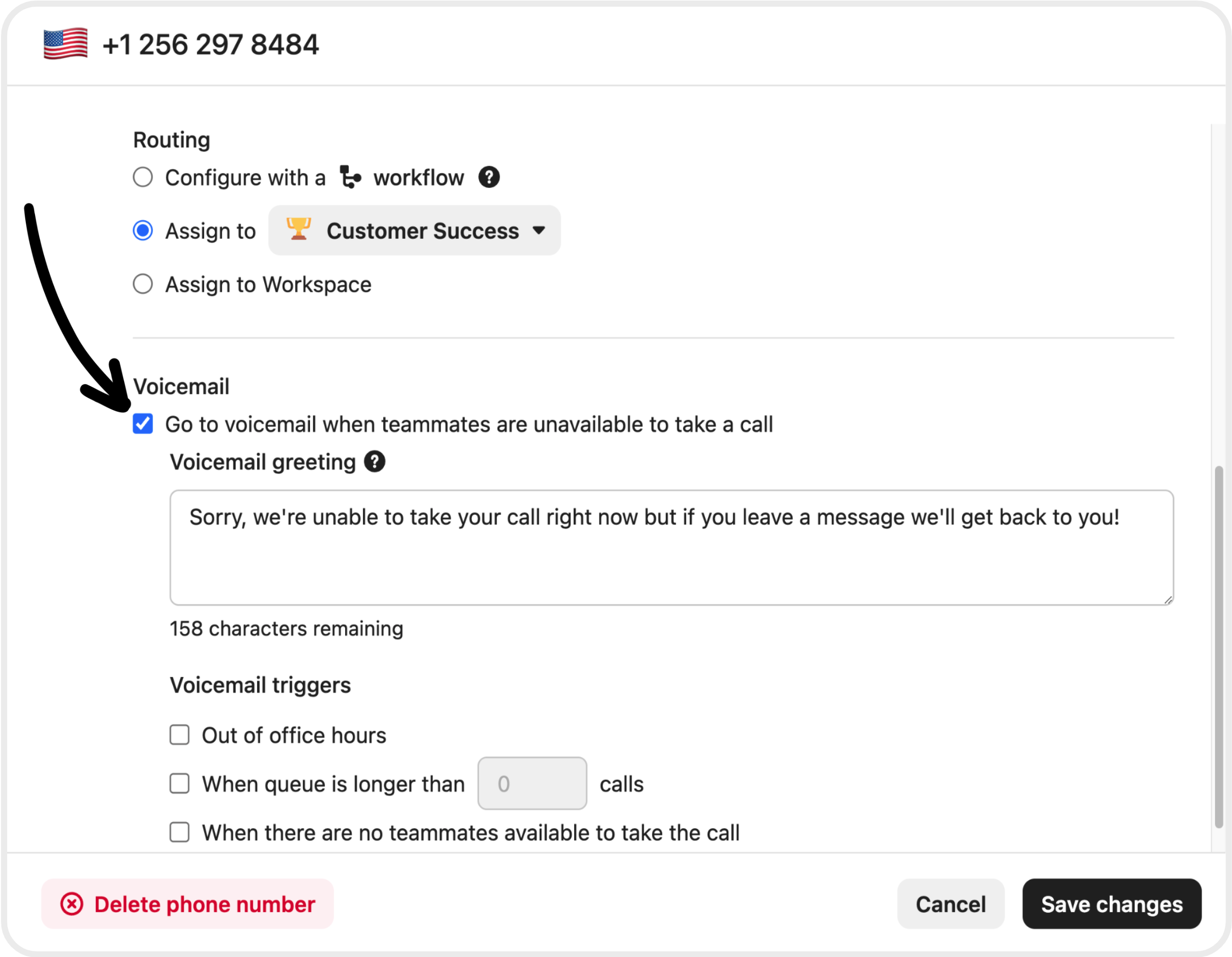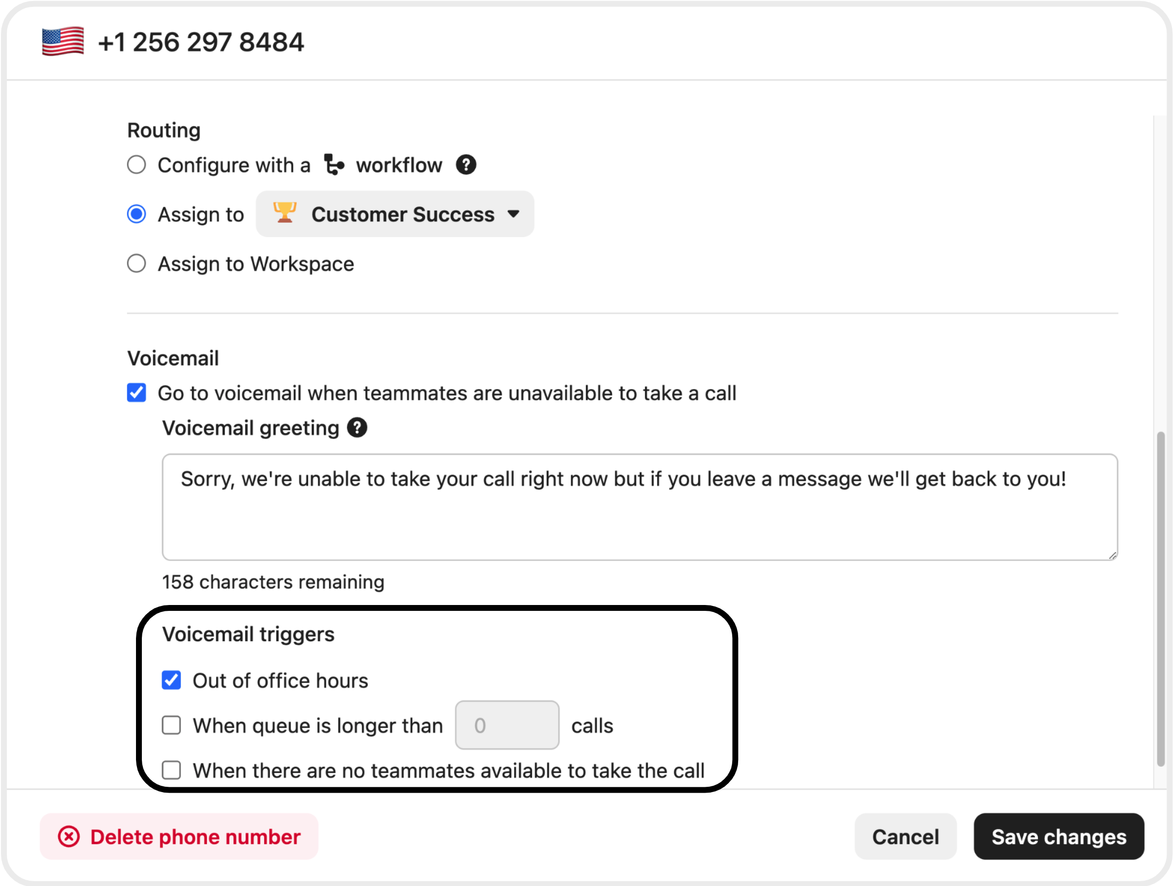 For the remaining routing options - "Assign to..." and "Assign to Workspace" - you can set up voicemail for those instances where teammates are unavailable. Voicemails will appear in the inbox just like recordings and transcripts for completed calls.