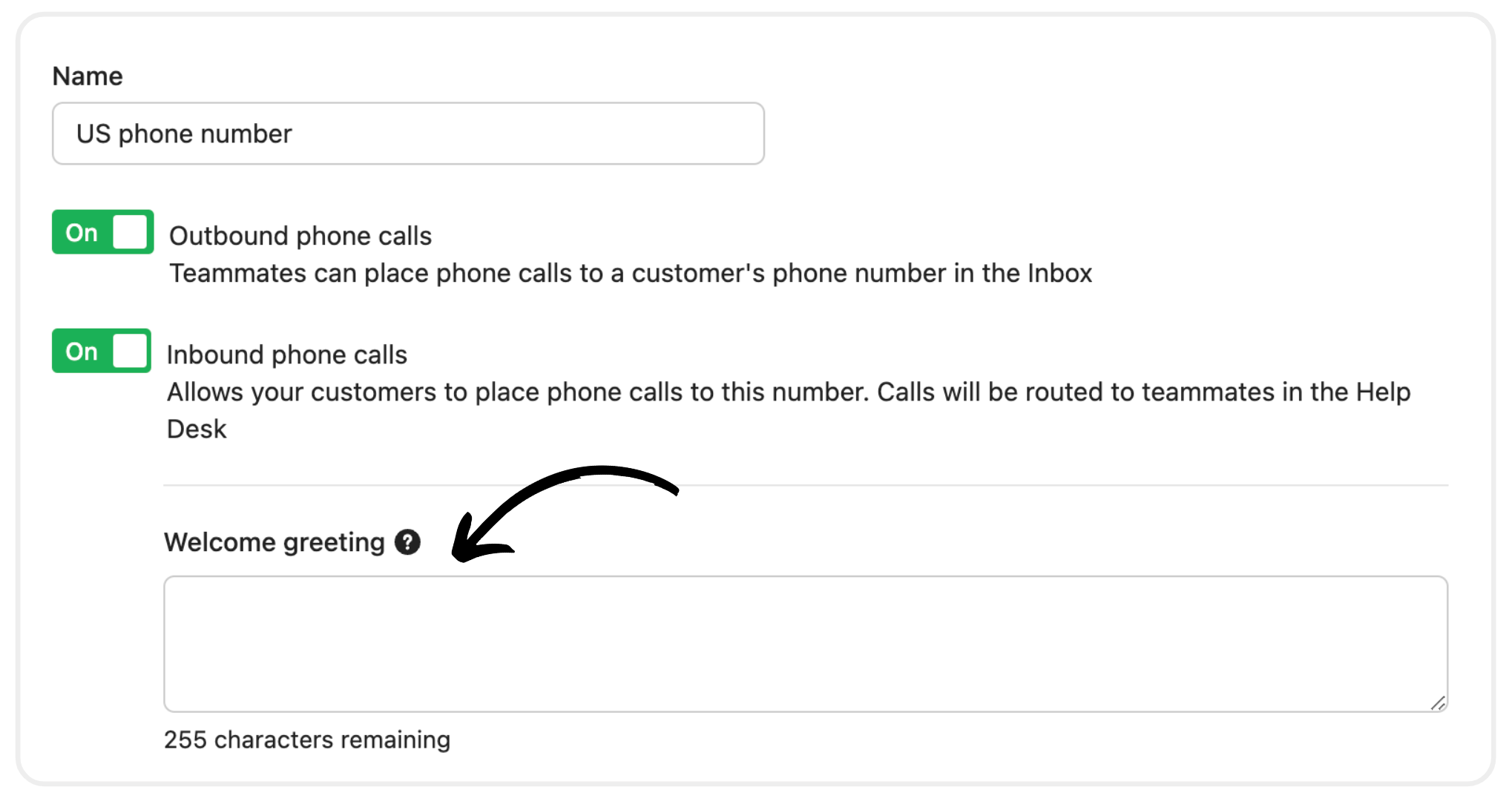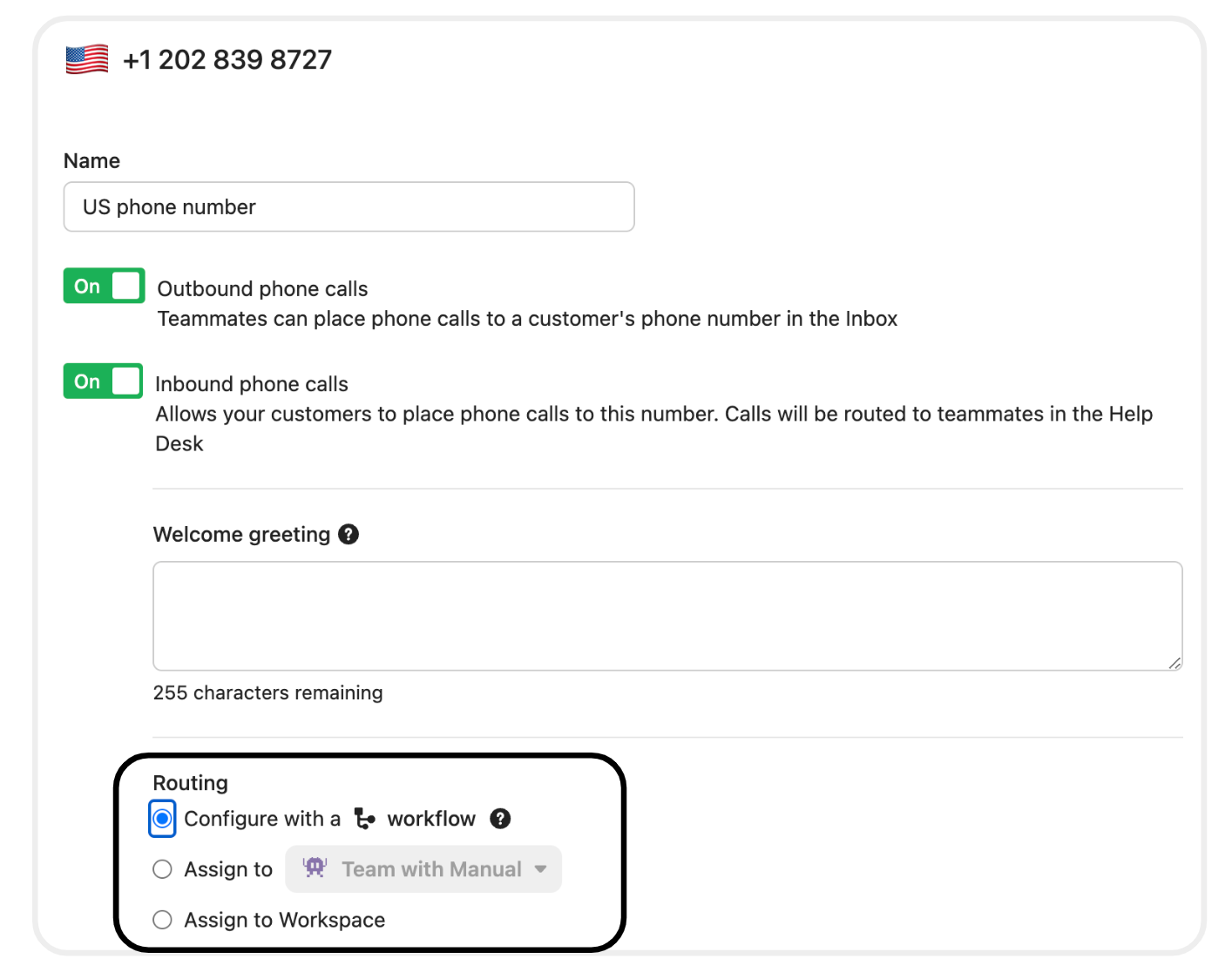 If you turn on Inbound phone calls, you’ll have the option to enter a welcome greeting. This message will be played when a customer calls the number, before they are routed to the configured workflow or team.