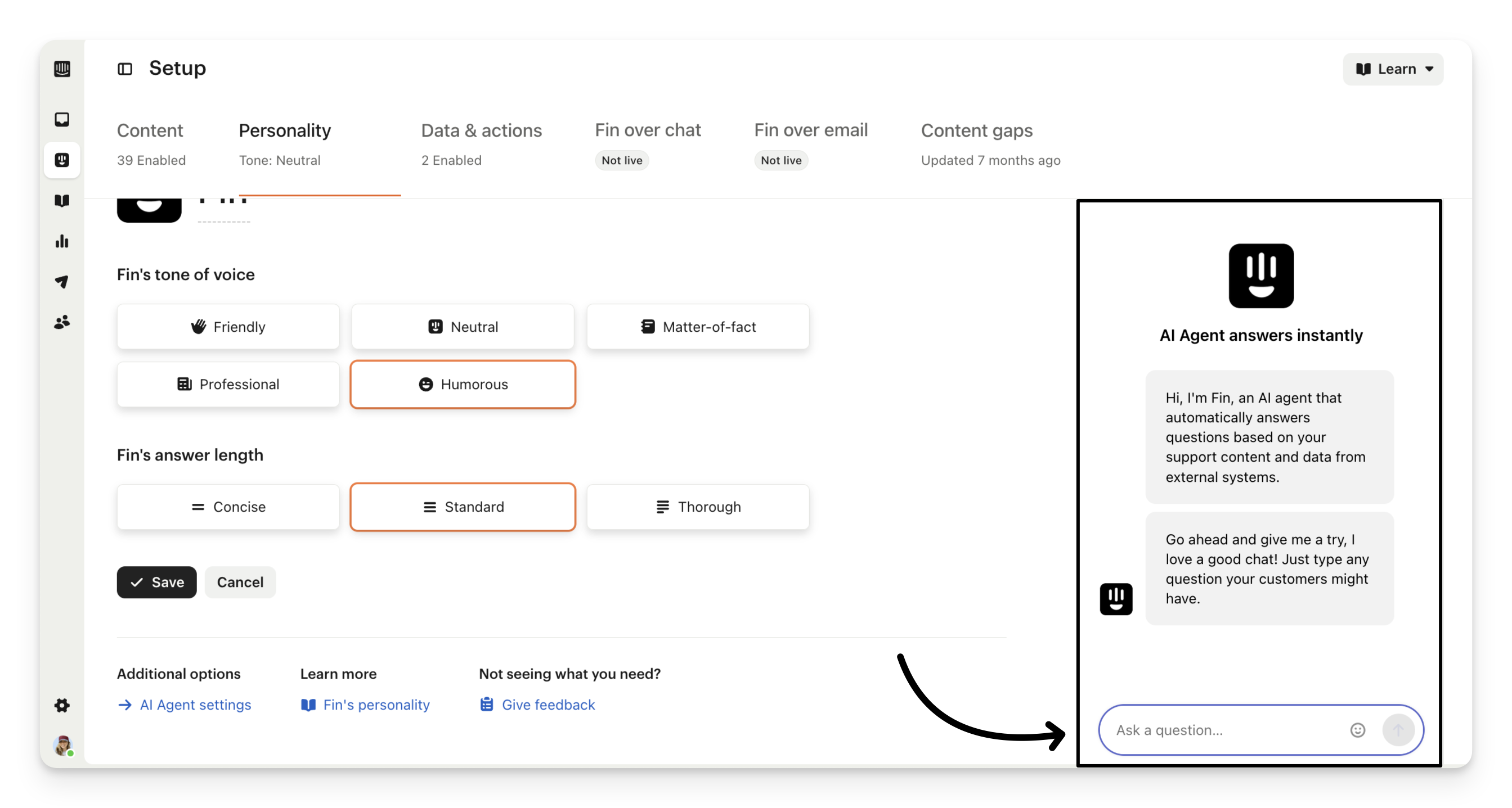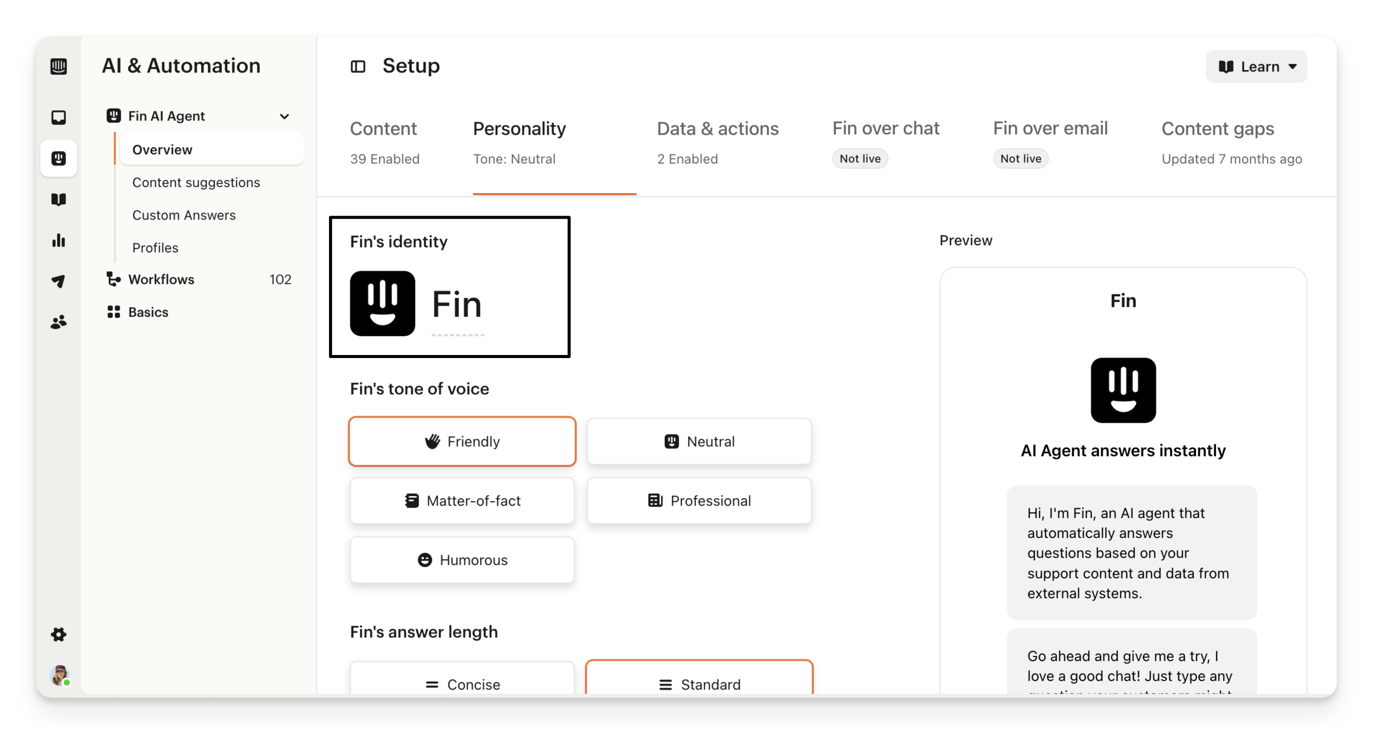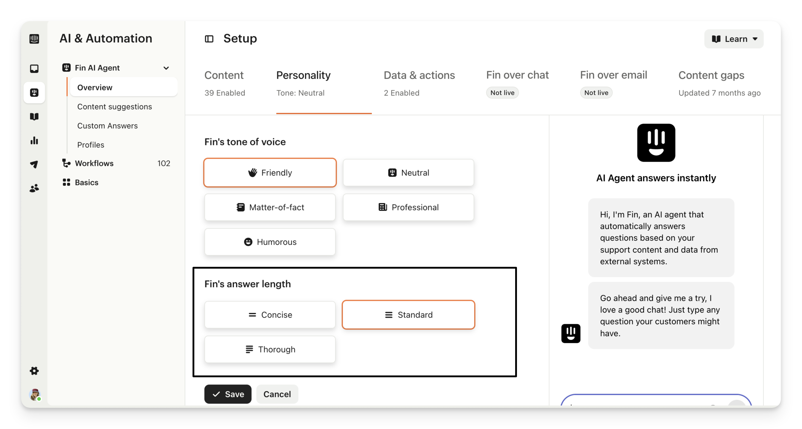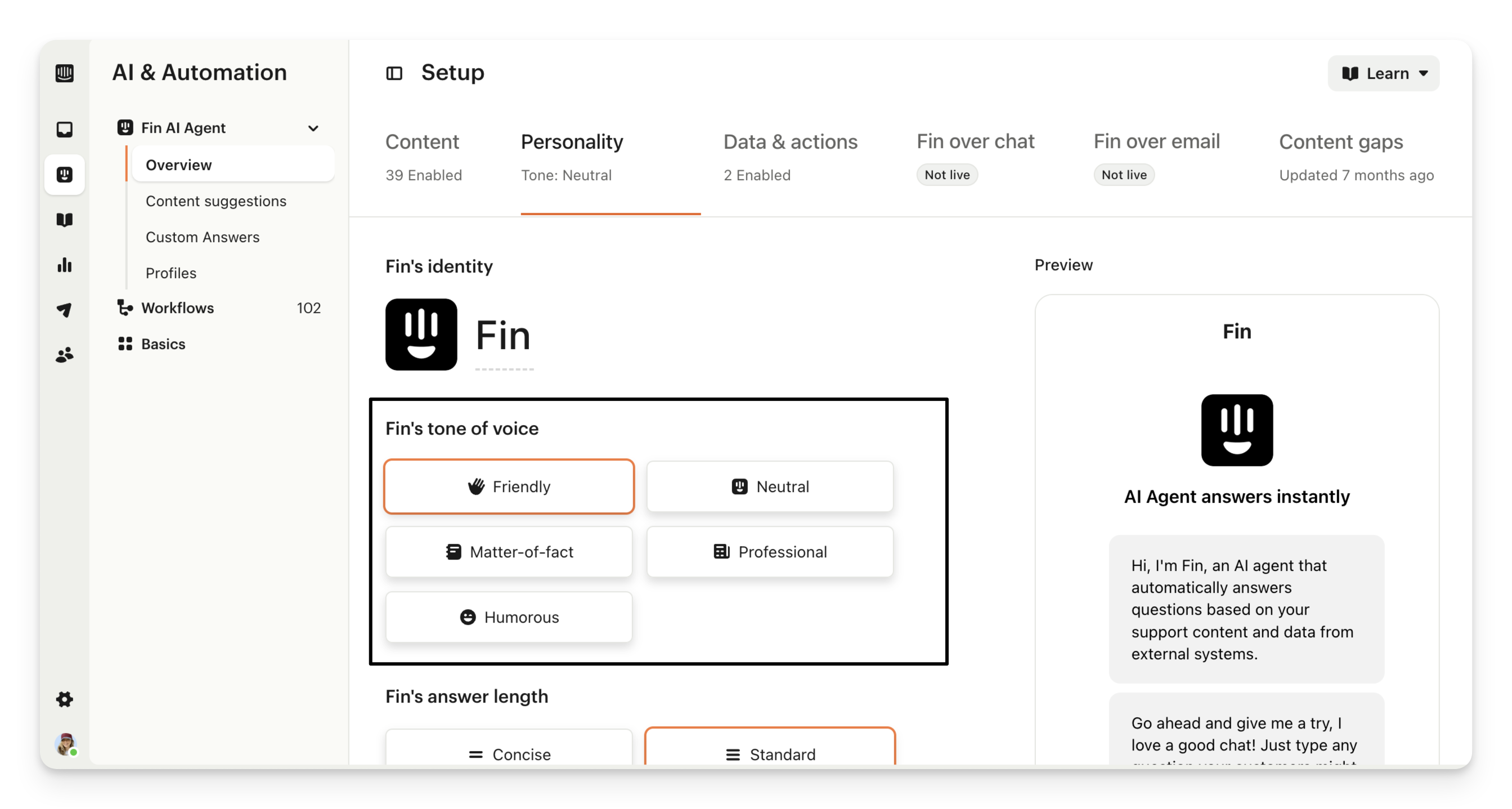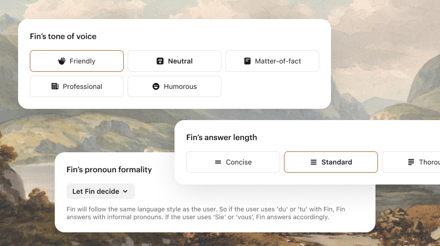 Fin can incorporate your brand identity, tone of voice, and preferred answer length. Choose from a selection of tone of voice options like professional, friendly, humorous, and more. Then select how long Fin’s answers are, from shorter and concise, to longer and more thorough. These settings will be applied in all the languages you support.