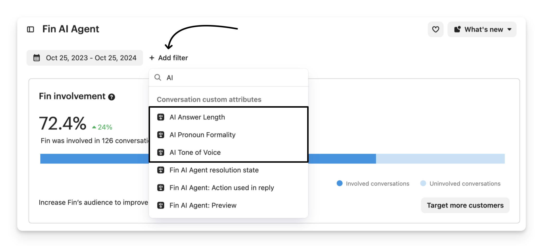 To see the impact of these settings on Fin's performance, you can filter by three conversation custom attributes available in custom reports and native reports: