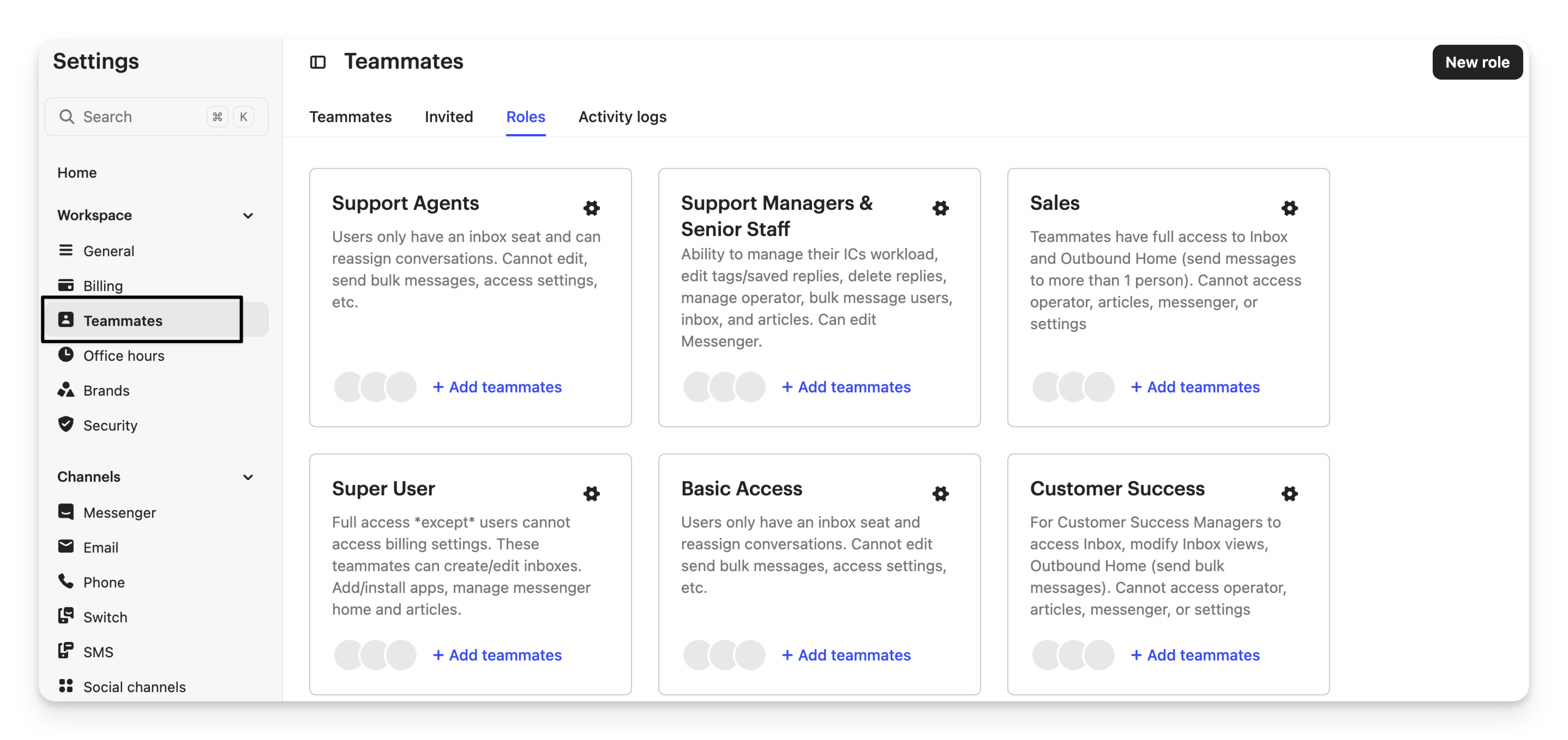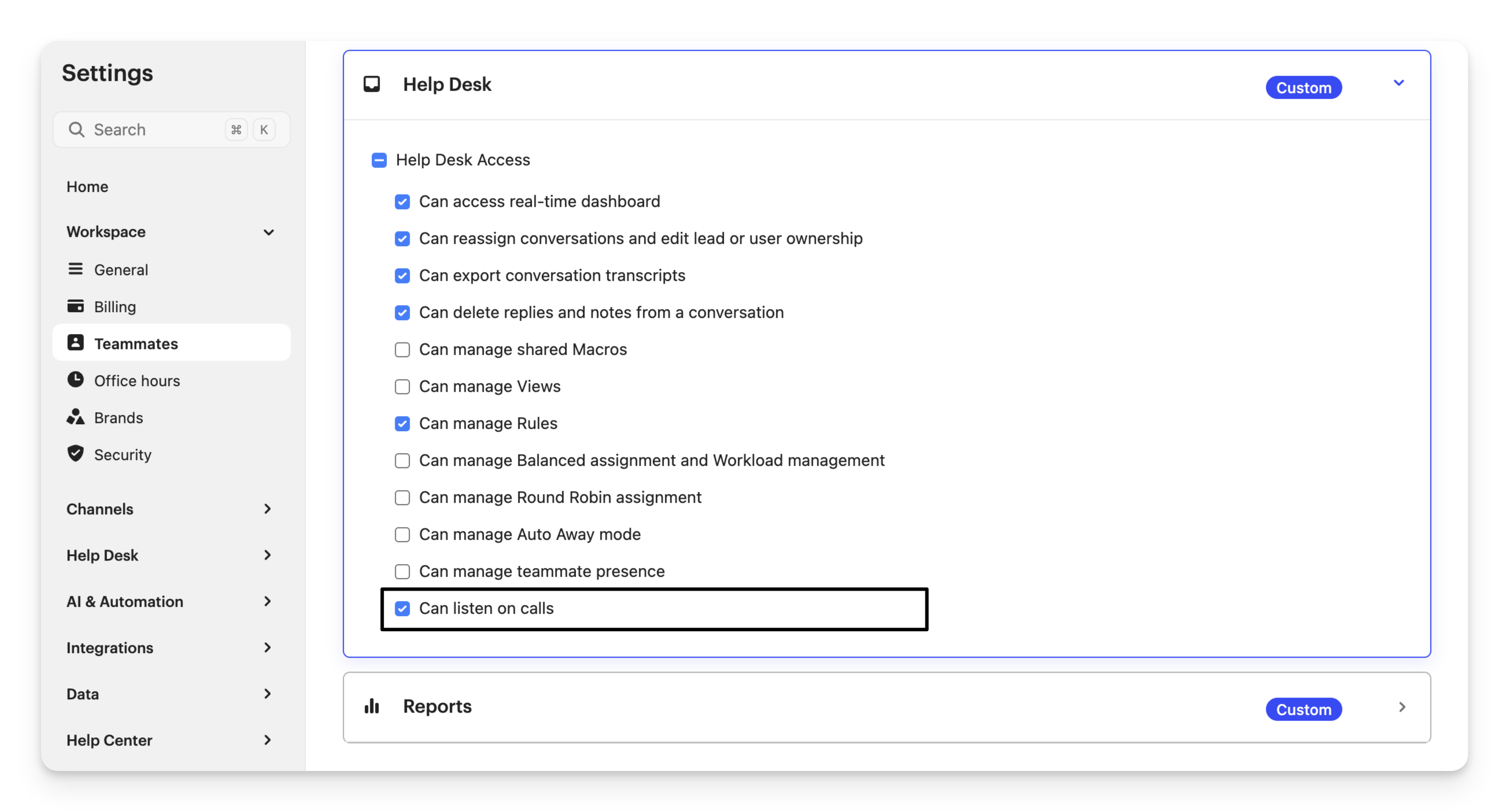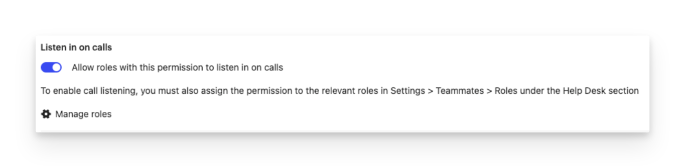 Call listening permission must then be assigned to teammates by navigating to Settings > Workspace > Teammates > Roles and selecting the specific role(s) who need permission.