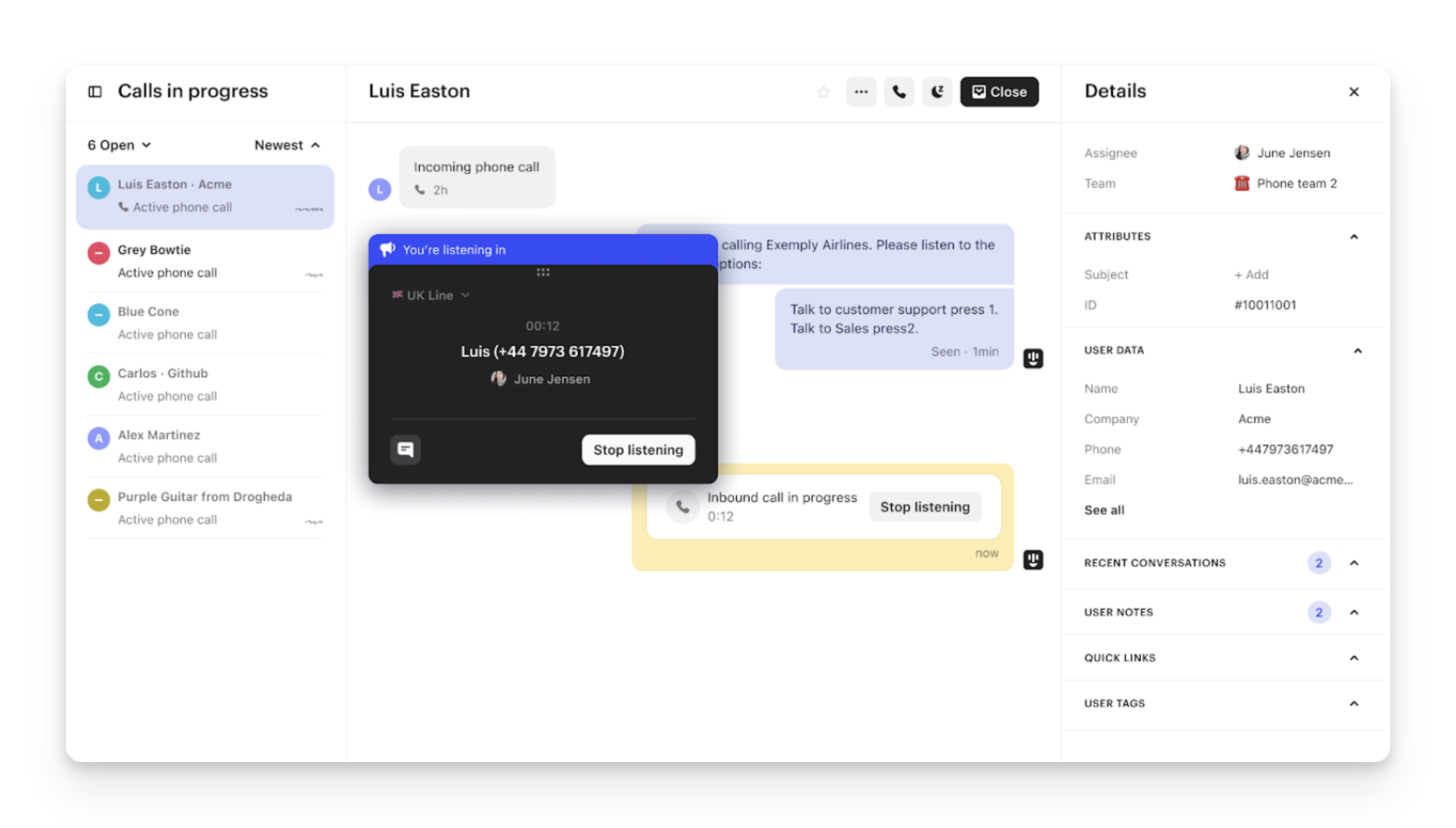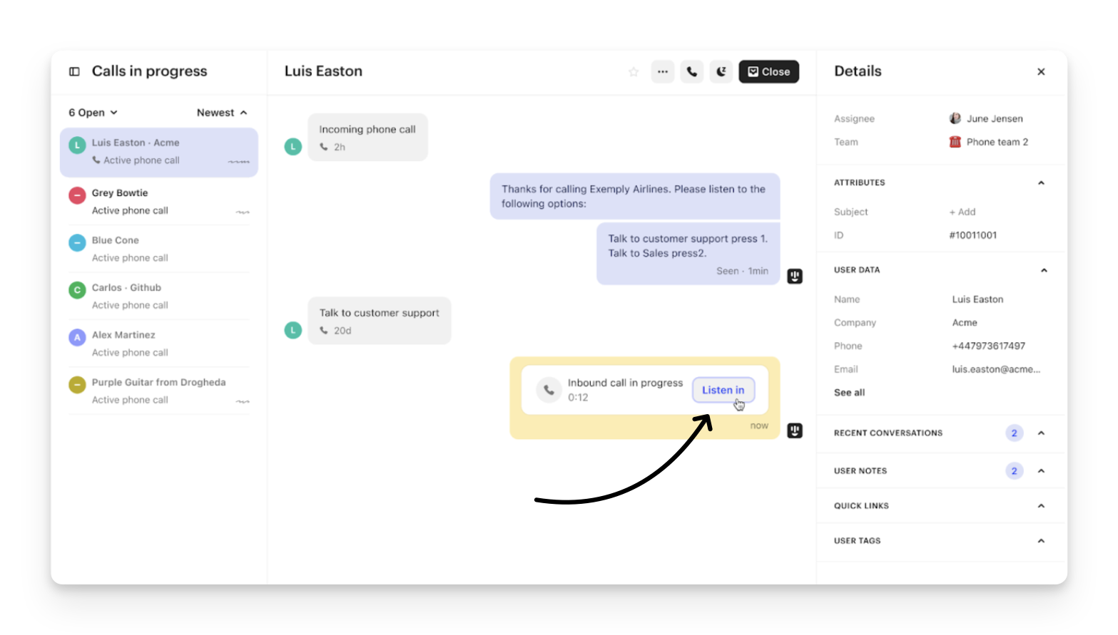 For calls in progress, eligible teammates (for the role you enabled above) will see the option to Listen in when viewing the conversation in the Inbox.
