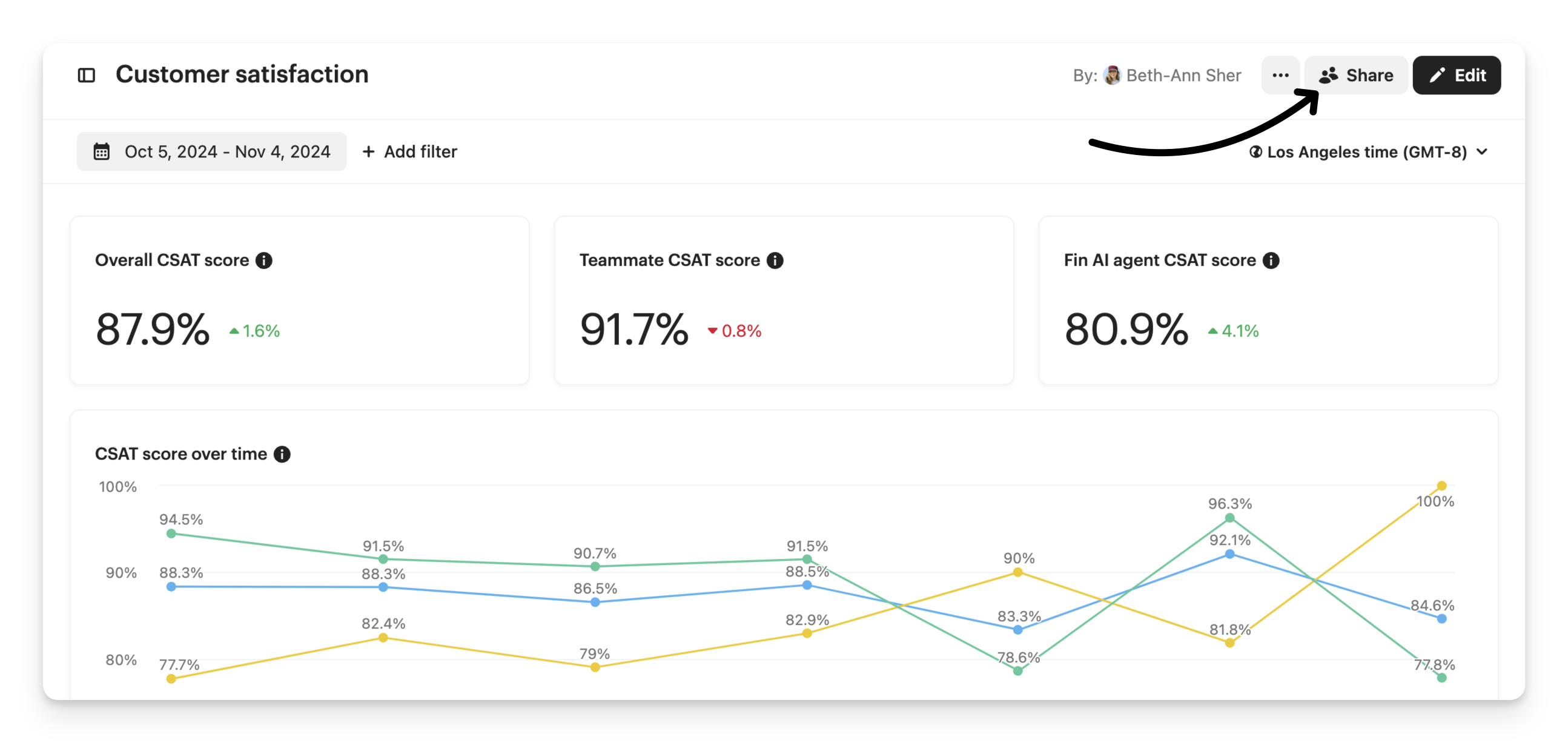 Click the Share button at the top of your report to set it as private, share it with select teammates/roles, or make it accessible to all teammates with reporting permissions within your workspace.
