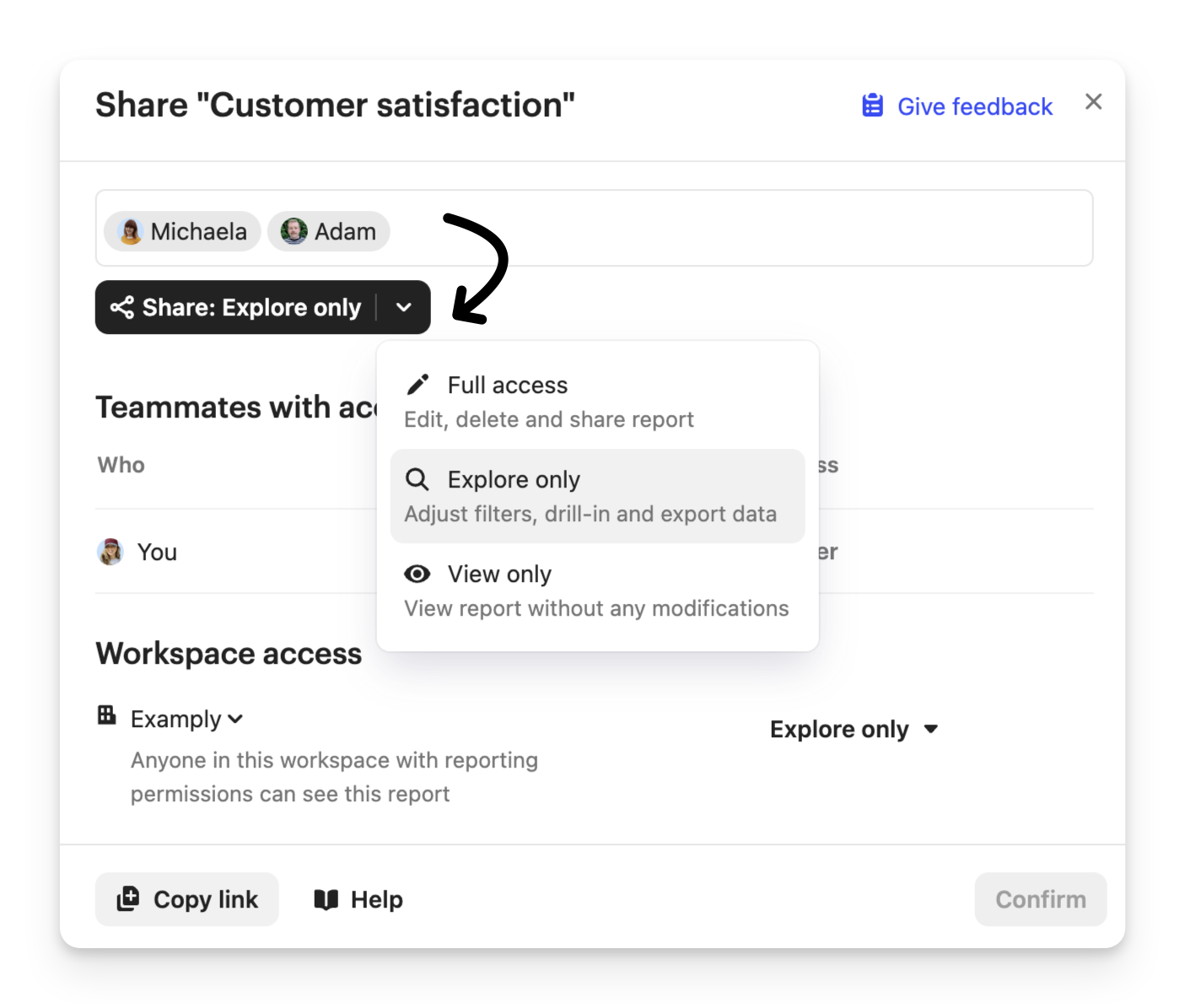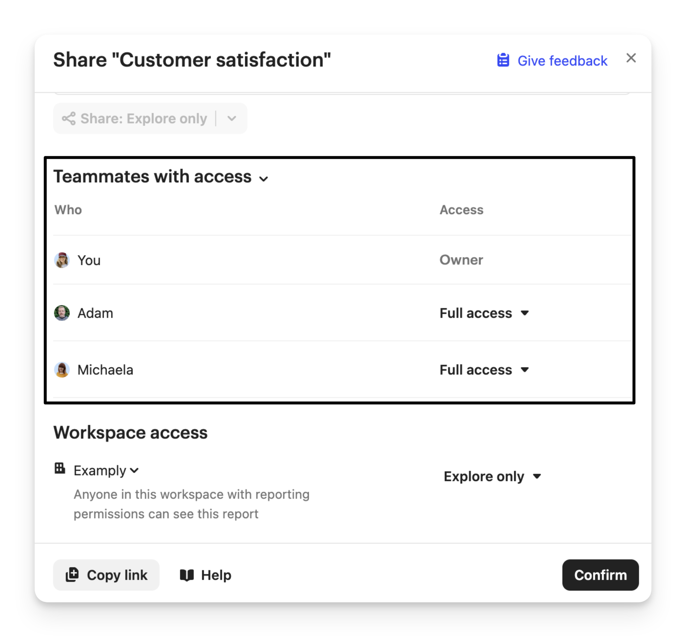 Action confirmation: Make sure to click Confirm in the bottom right corner after making changes to report access. If this step is missed, the share action won’t be saved, and your teammate won't gain access.
