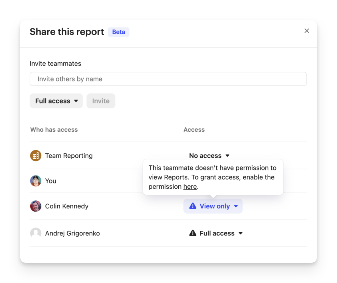 Full access: Allows teammates to edit, delete, and share reports with others, granting complete control over the report’s content and dissemination.