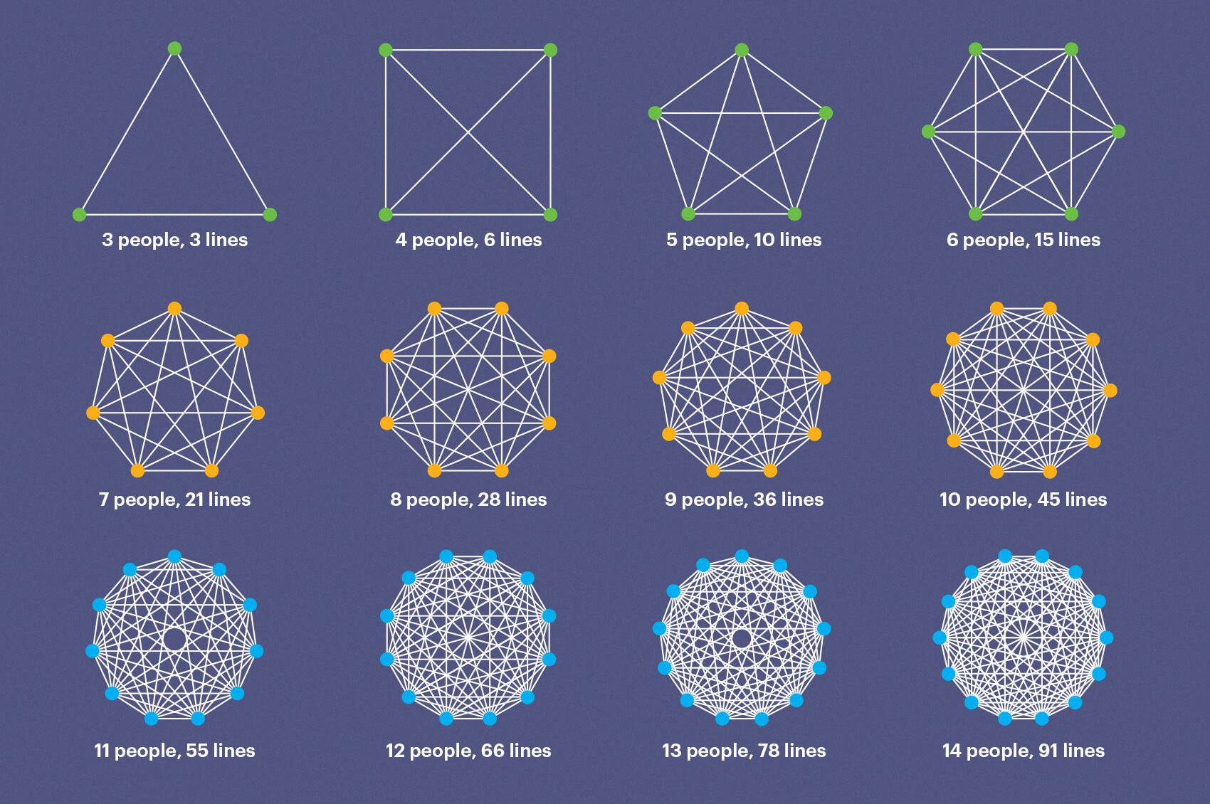 In his 1975 book, The Mythical Man-Month, Fred Brooks observed how adding people to a team often drove inefficiency, increased communication overhead, and had little impact on the efficacy of the team. According to Brooks, adding more people to a late software project usually delays it even more. Simply increasing the number of people at your company or working long hours to offset inefficiencies doesn’t guarantee a return to effective, co-ordinated work. It can actually make things worse by creating more communication lines, which can increase the possibility of misalignment.