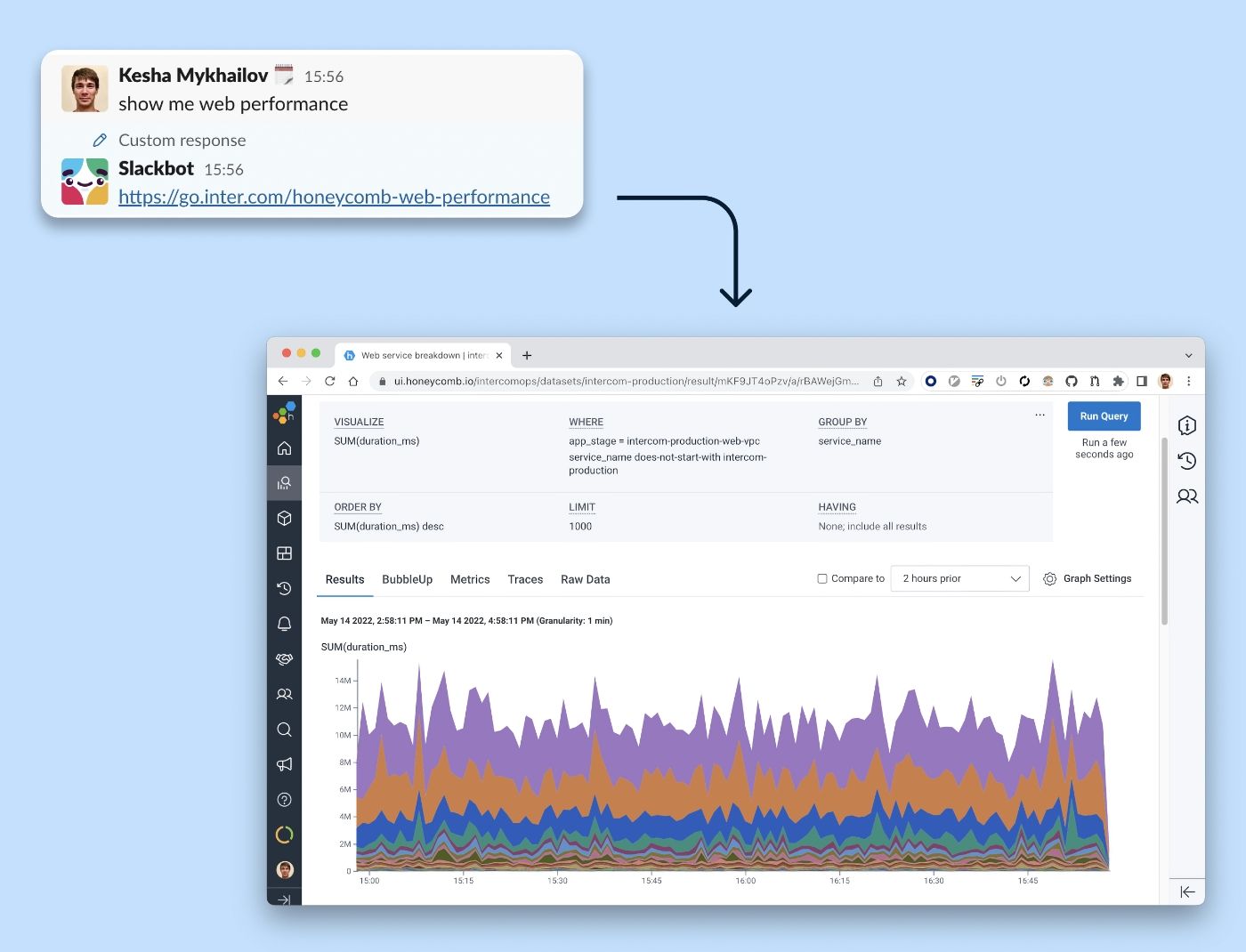 We streamline our observability workflow with a Slackbot that provides a shortcut to a popular query within our observability tooling