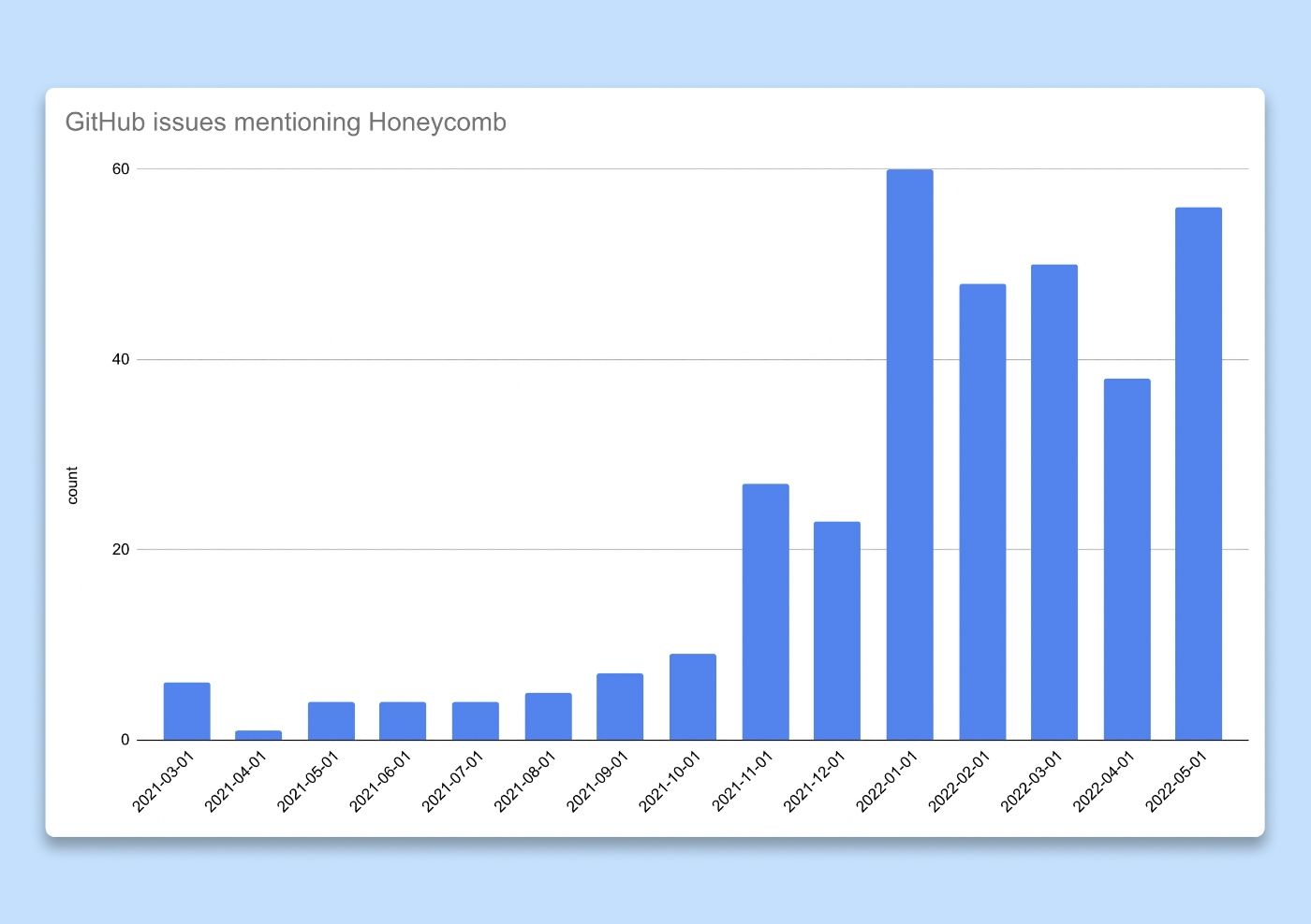 Bar chart showing the number of GitHub issues where Honeycomb is mentioned in the title or description