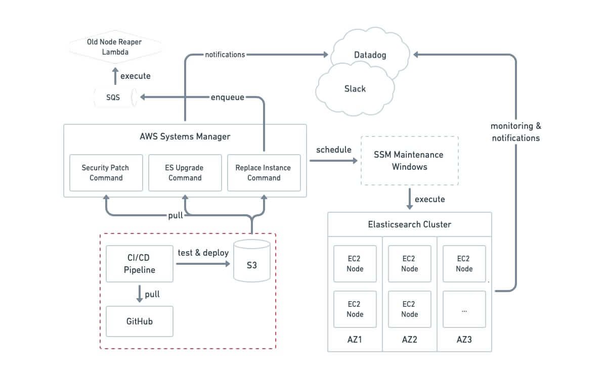 - Flexible instance discovery using tags allows targeting only specific groups of instances. For example, we split the ES primary and replica data (called “shards”) per availability zone (AZ) to minimize the blast radius and let the system perform updates per AZ, always leaving the cluster in a healthy state.