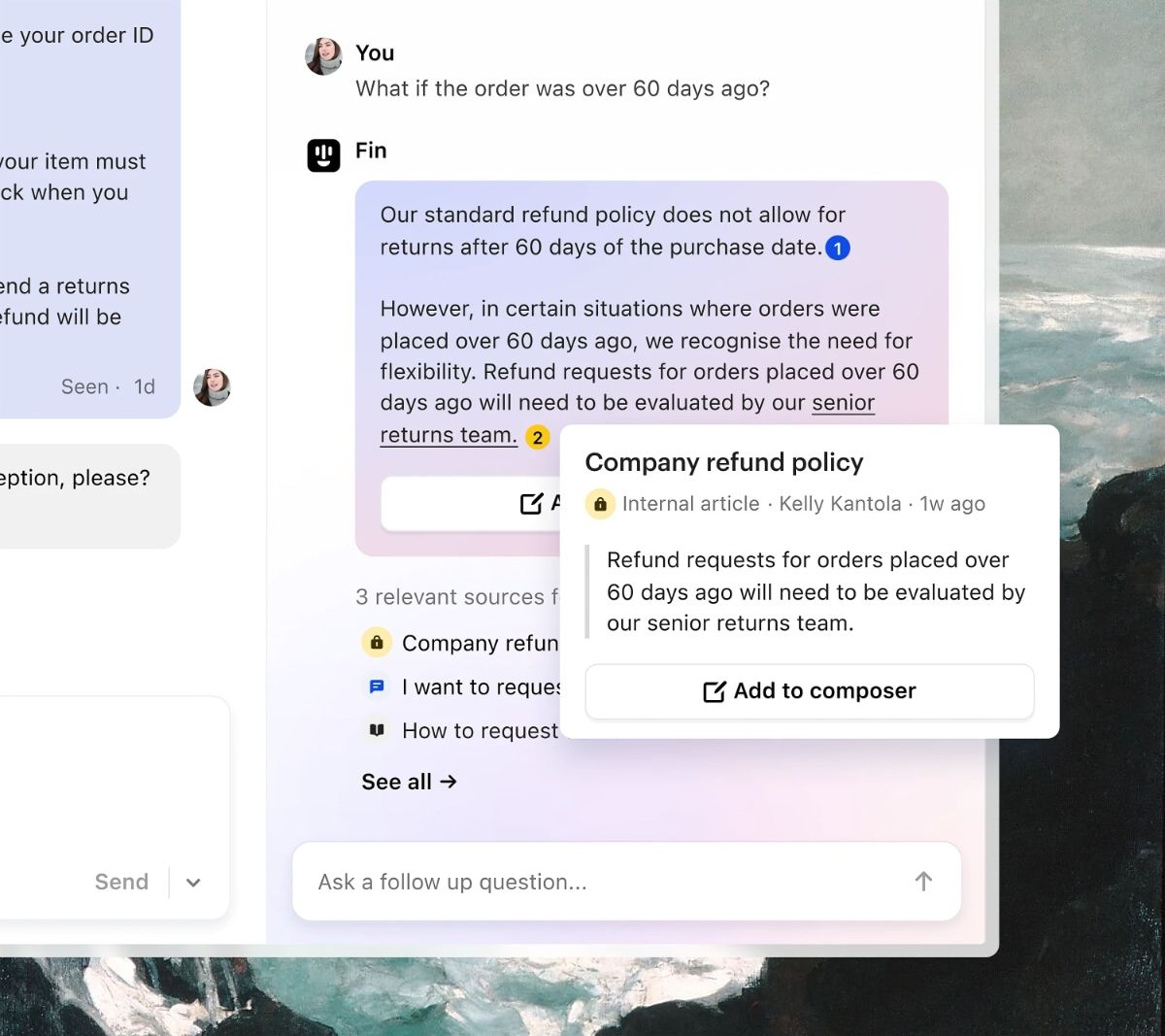 By drawing on your internal articles, it can provide agents with instructions on how to handle queries. This is especially useful to onboard and train new agents – they can simply use Fin to get up to speed with handling unfamiliar situations. And best of all, that guidance is immediate, and in-context.